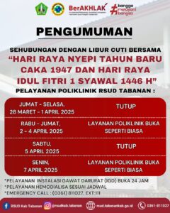 TABANAN ERA BARU Bersama Bergotong Royong Membangun Tabanan Aman Unggul dan Madani Sehubungan dengan Libur Cuti Bersama Hari Raya Nyepi...