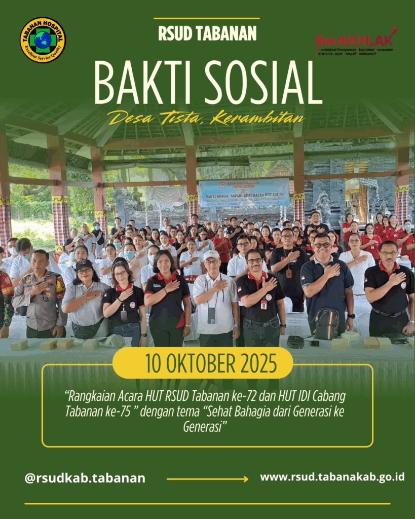 Tabanan, 10 Oktober 2025, menyemarakkan Rangkaian Acara HUT RSUD Tabanan ke-72 dan HUT IDI Cabang Tabanan ke-75 dengan tema “Sehat Bahagia dari Generasi ke Generasi” maka akan diadakan bhakti sosial untuk kelompok lansia di desa Tista Kerambitan dan juga anak sekolah dasar di SD Negeri 1 Tista Kerambitan.