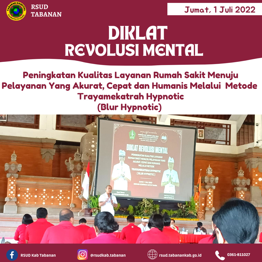RSUD Tabanan berpartisipasi dalam diklat revolusi mental yang diinisiasi oleh Pemerintah Kabupaten Tabanan mengusung tema “Peningkatan Kualitas Layanan Rumah Sakit Menuju Pelayanan yang Akurat, Cepat dan Humanis†melalui Metode Trayanekatrah Hypnotic (Blur Hypnotic) pada Jumat (1/7/2022). Diklat revolusi mental ini dibuka langsung oleh Bapak Bupati Tabanan, Dr. I Komang Gede Sanjaya., S.E., M.M. Diklat revolusi mental ini ditunjukkan bagi tenaga medis selaku garda terdepan dalam pelayanan masyarakat dibidang kesehatan dengan narasumber Dr. Ketut Gede Suatma Yasa, SH, M.Ag, CHt, MNNLP. Workshop dilaksanakan agar dapat meningkatkan kualitas sumber daya manusia yang ada di rumah sakit untuk memberikan pelayanan yang akurat, cepat dan humanis melalui metode Trayanekatrah Hypnotic.