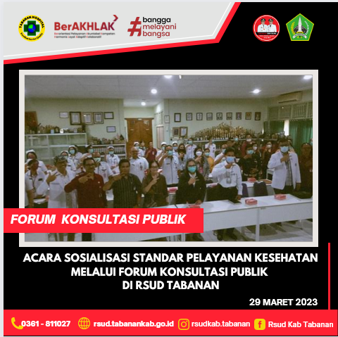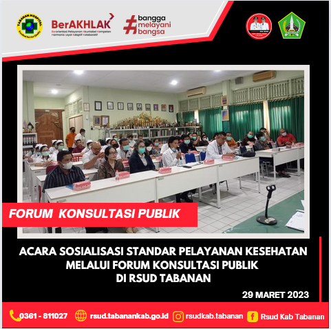 Komitmen RSUD Tabanan adalah menghadirkan pelayanan public yang berkualitas, serta memberikan kemudahan, kecepatan, dan kenyamanan kepada masyarakat dengan  transfarasi dalam setiap kegiatannya, mengembangkan diri melalui inovasi layanan unggulan. Agar pelayanan sesuai dengan harapan masyarakat RSUD Tabanan memerlukan saran dan masukan dari masyarakat yang mewakili berbagai unsur profesi masyarakat pengguna layanan melalui forum konsultasi publik (FKP). Sesuai dengan UU 25 tahun 2009 tentang pelayanan public dan permenPAN RB Nomor 16 Tahun 2017 tentang Pedoman penyelenggaraan Forum konsultasi publik di Lingkungan unit penyelenggara forum pelayanan public. Sosialisasi Standar Pelayanan melalui Forum Konsultasi Publik (FKP) dilaksanakan pada Hari Rabu, 29 Maret 2023 yang dihadiri oleh masyarakat pengguna layanan, Ahli/Praktisi/Akademia, Instansi terkait, Organisasi Masyarakat Sipil dan Jurnalis.
