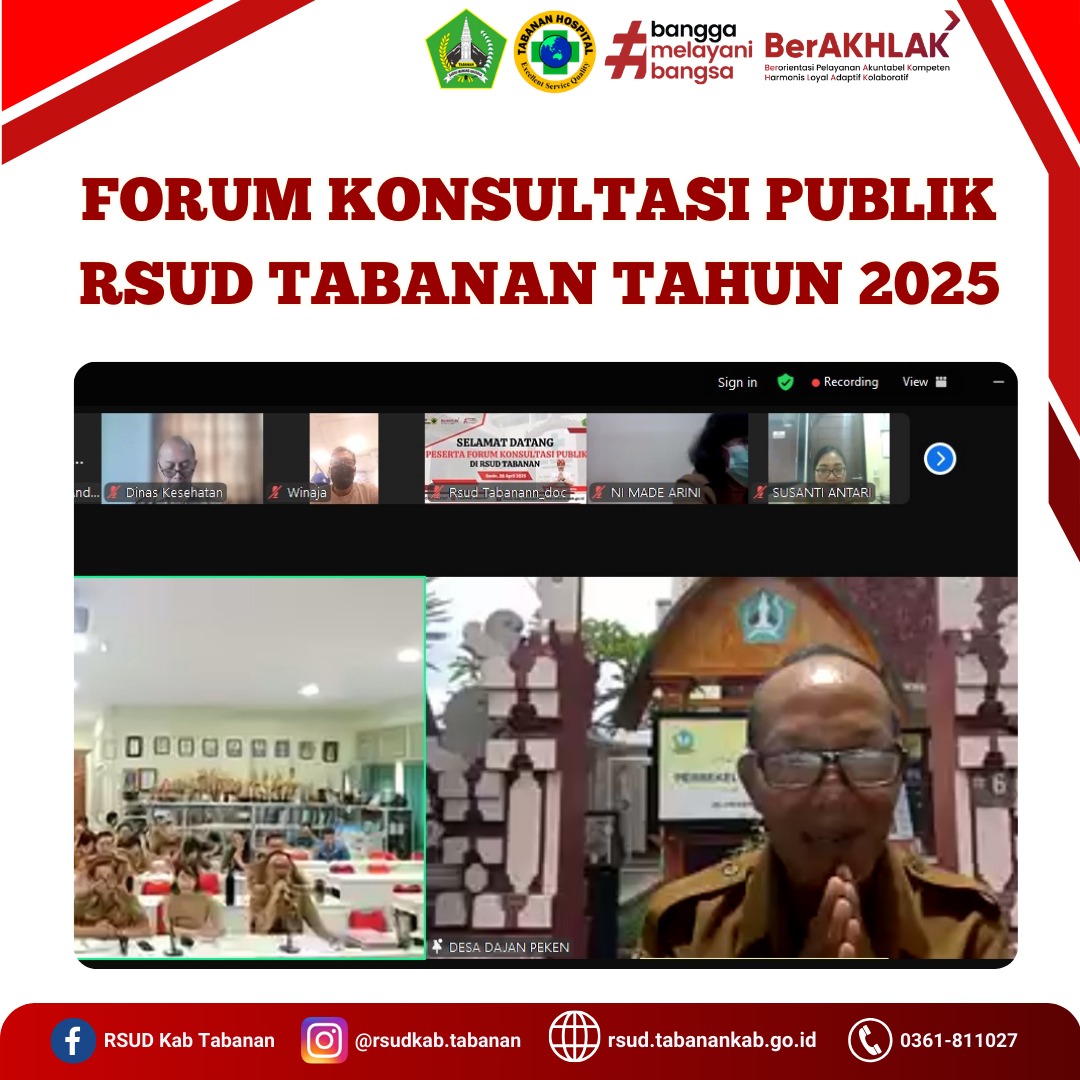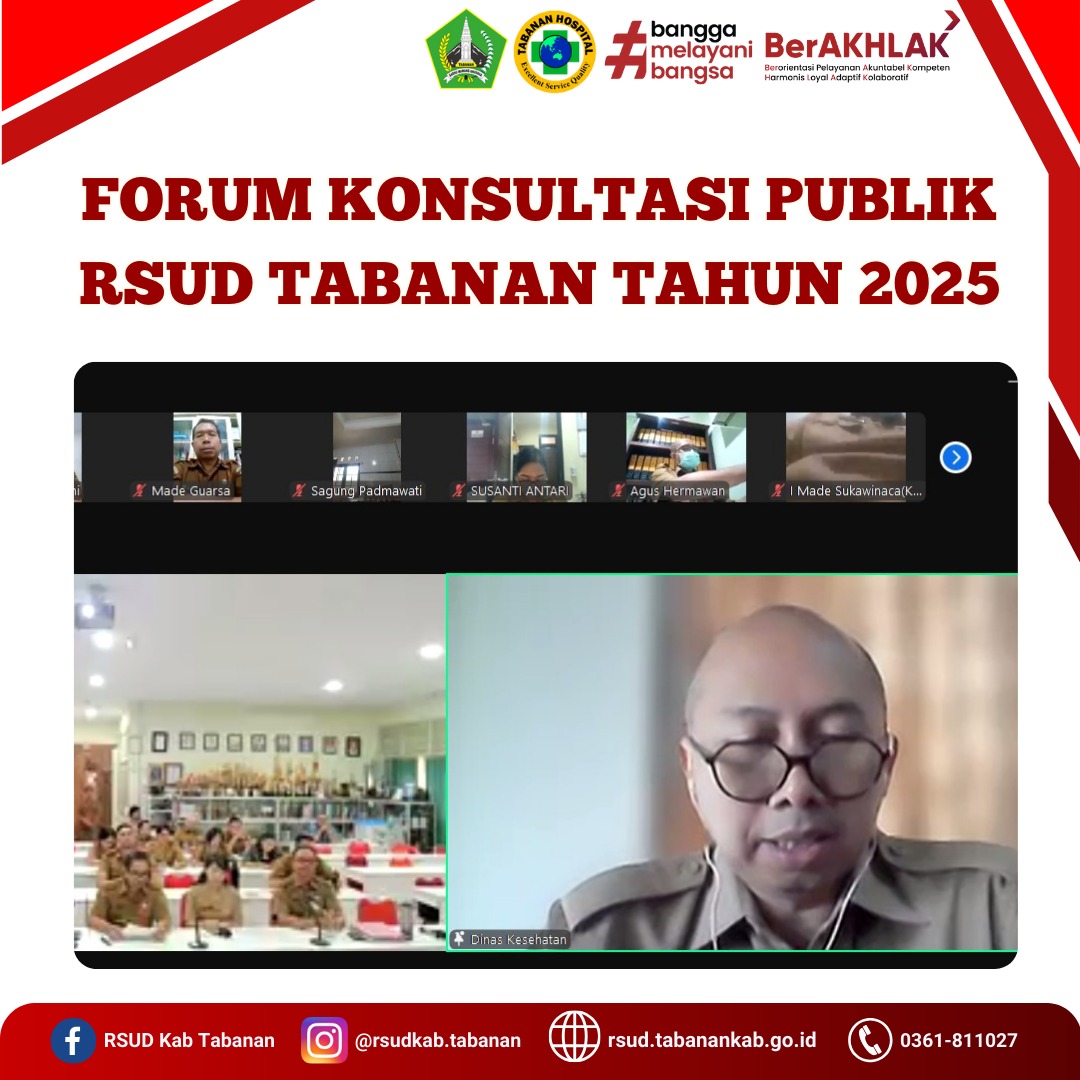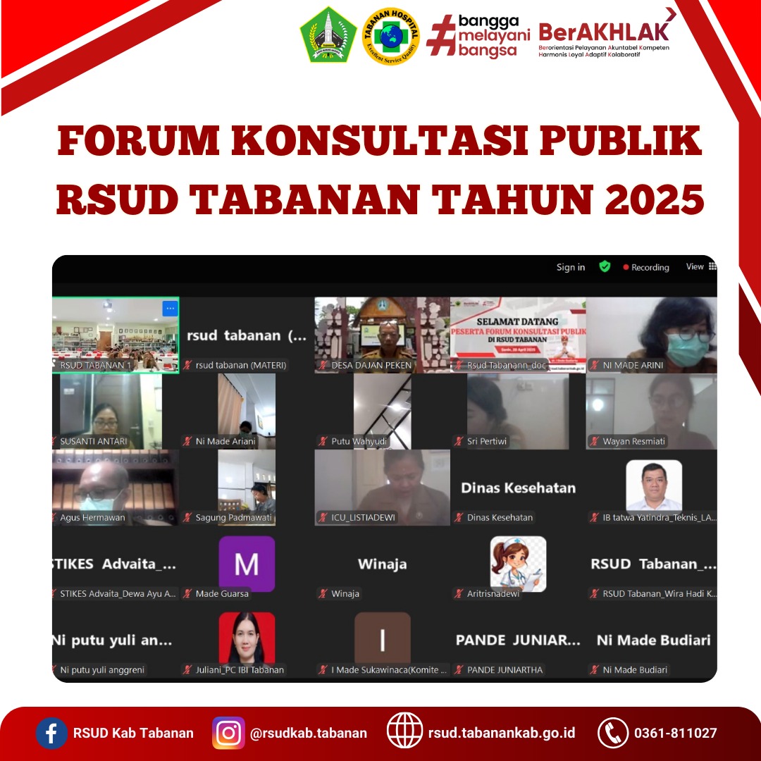 Senin, 28 April 2025 RSUD Tabanan melaksanakan kegiatan Forum Konsultasi Publik (FKP) Tahun 2025 melalui Zoom Meeting. Kegiatan FKP RSUD Tabanan Tahun 2025 dibuka secara resmi oleh Plt. Sekretarias Dinas Kesehatan Kabupaten Tabanan, dr. Anak Agung Ngurah Putra Wiradarma, M.A.R.S. Dalam sambutannya, beliau menyampaikan pelaksanaan Forum Konsultasi Publik bertujuan untuk memberikan informasi terkait pelayanan-pelayanan yang diberikan oleh RSUD Tabanan dan sekaligus sebagai wadah mengumpulkan aspirasi masyarakat untuk perbaikan kualitas pelayanan publik kepada masyarakat.