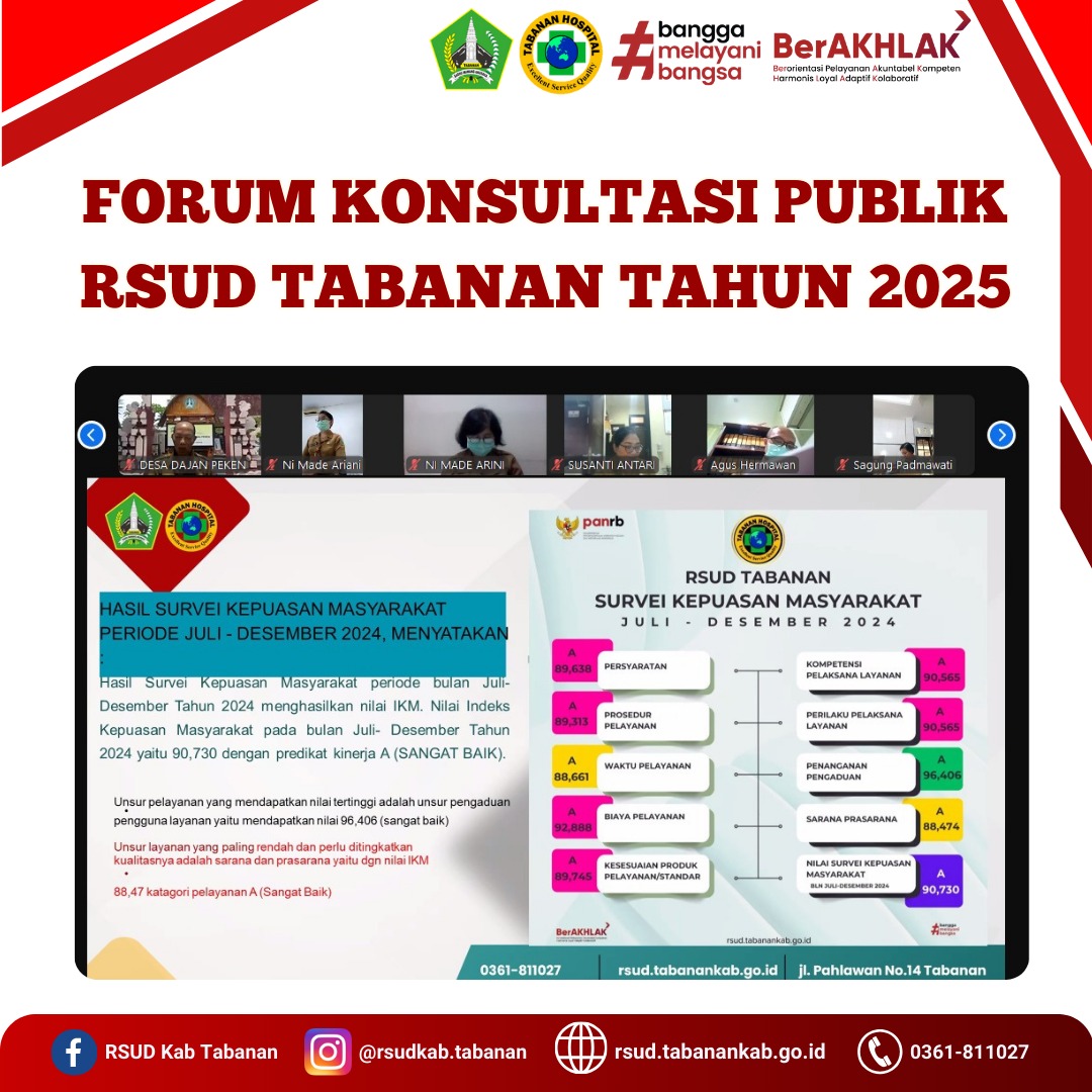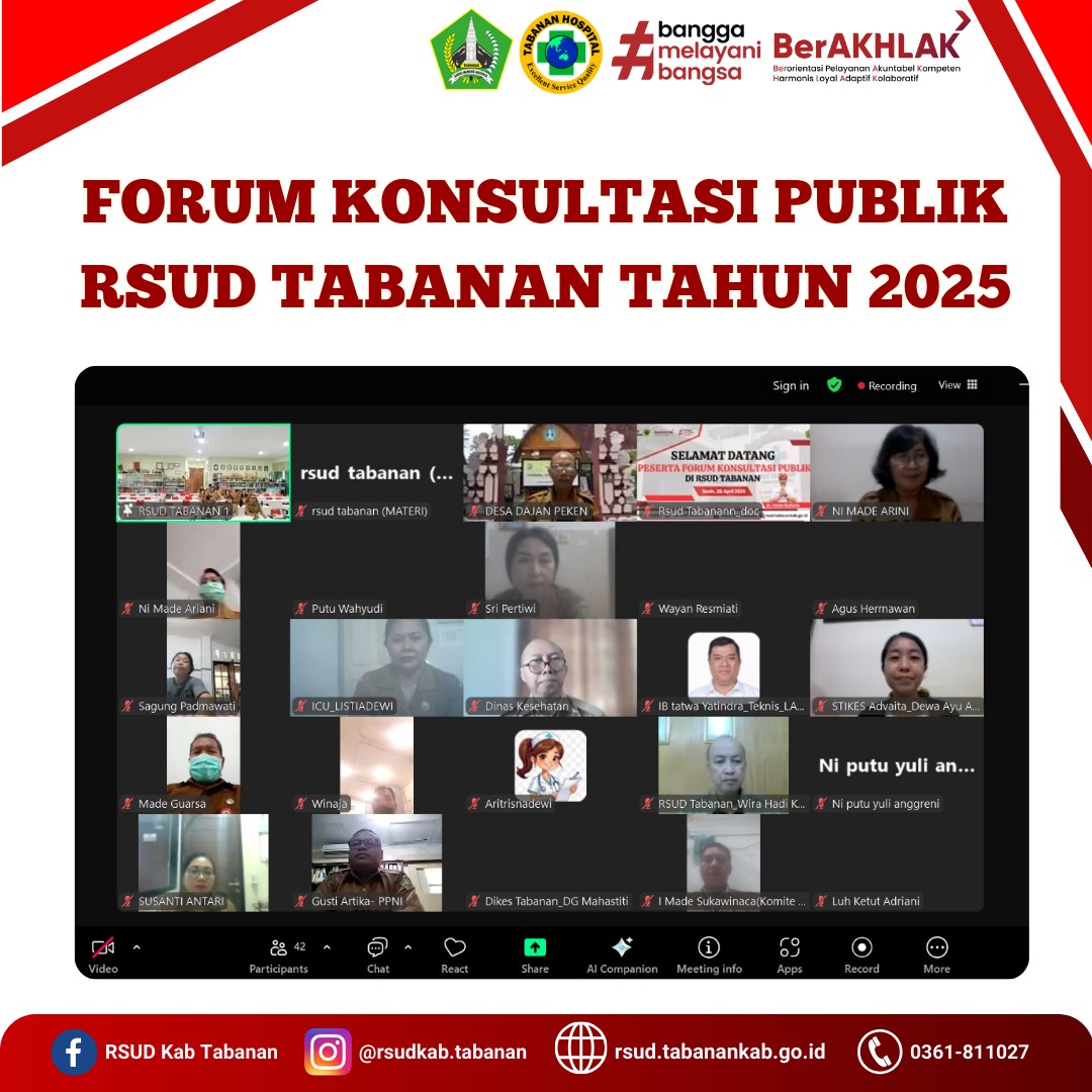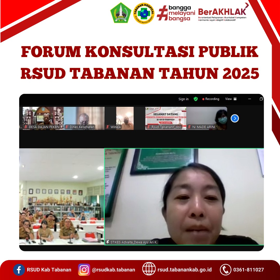 Senin, 28 April 2025 RSUD Tabanan melaksanakan kegiatan Forum Konsultasi Publik (FKP) Tahun 2025 melalui Zoom Meeting. Kegiatan FKP RSUD Tabanan Tahun 2025 dibuka secara resmi oleh Plt. Sekretarias Dinas Kesehatan Kabupaten Tabanan, dr. Anak Agung Ngurah Putra Wiradarma, M.A.R.S. Dalam sambutannya, beliau menyampaikan pelaksanaan Forum Konsultasi Publik bertujuan untuk memberikan informasi terkait pelayanan-pelayanan yang diberikan oleh RSUD Tabanan dan sekaligus sebagai wadah mengumpulkan aspirasi masyarakat untuk perbaikan kualitas pelayanan publik kepada masyarakat.