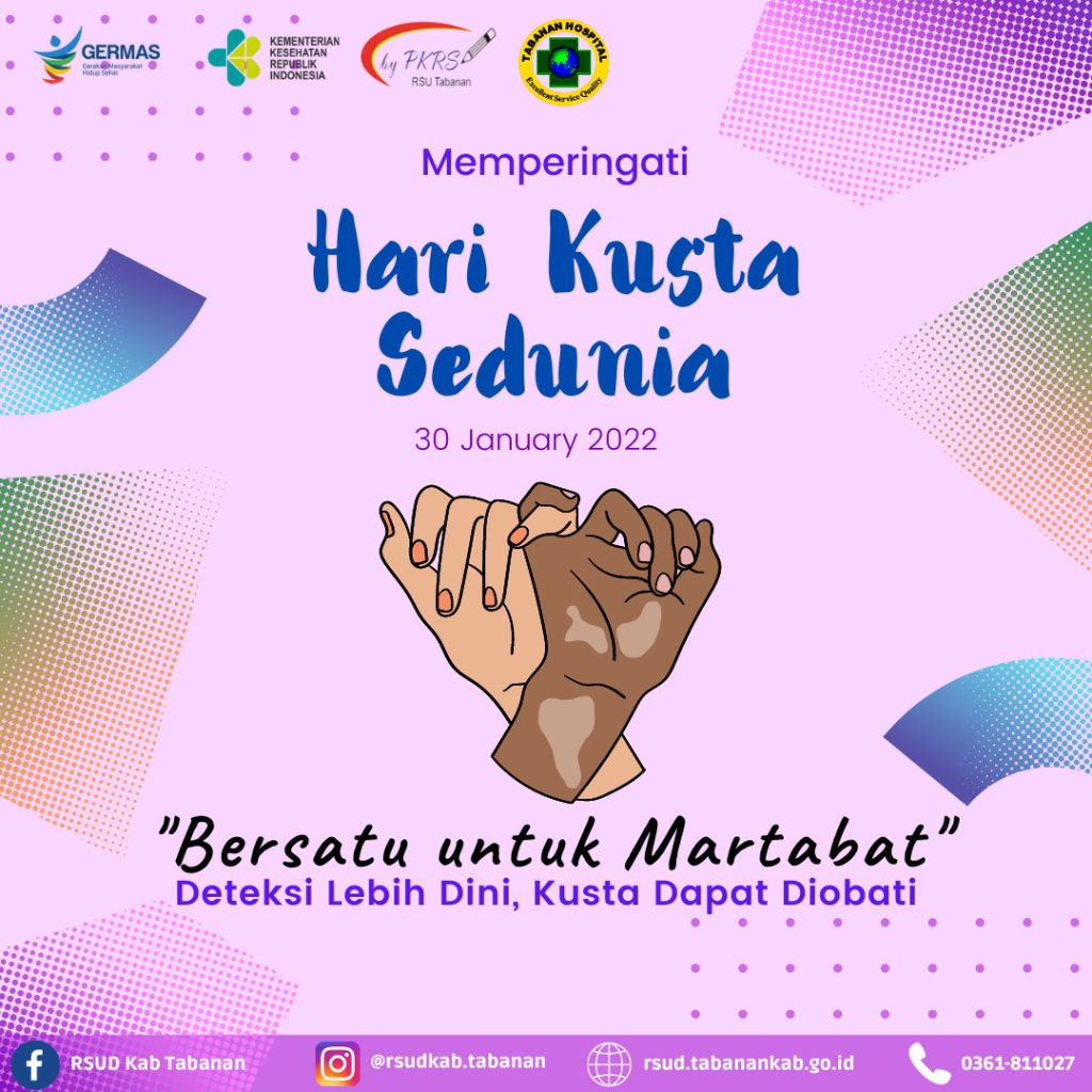 Semeton RSUD Tabanan, Hari Minggu terakhir di bulan Januari setiap tahun diperingati sebagai Hari Kusta Sedunia atau World Leprosy Day. Kusta atau Lepra disebabkan oleh bakteri Mycobacterium Leprae. Bakteri ini dapat menular dari satu orang ke orang lainnya melalui percikan cairan dari saluran pernapasan (droplet), yaitu ludah atau dahak, yang keluar saat batuk atau bersin. Pada tahun ini, hari tersebut bertepatan dengan tanggal 30 Januari 2022. Tema untuk Hari Kusta Sedunia 2022 adalah “United for Dignity†yang artinya “Bersatu untuk Martabatâ€. Maksud dari tema ini adalah sebuah kampanye menyerukan persatuan dalam menghormati martabat orang yang pernah mengalami kusta. Deteksi dini dan pengobatan yang tepat merupakan pencegahan yang paling baik untuk mencegah komplikasi sekaligus mencegah penularan lebih luas pada penyakit kusta. Selain itu, menghindari kontak dengan hewan pembawa bakteri kusta juga penting untuk mencegah kusta.