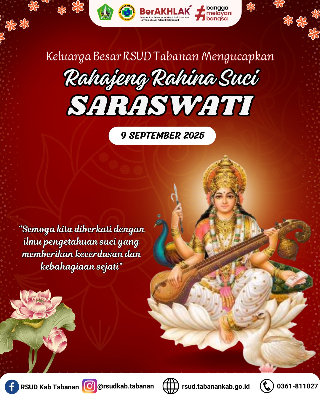 Keluarga Besar RSUD Tabanan mengucapkan RAHAJENG RAHINA SUCI SARASWATI bagi umat sedharma.