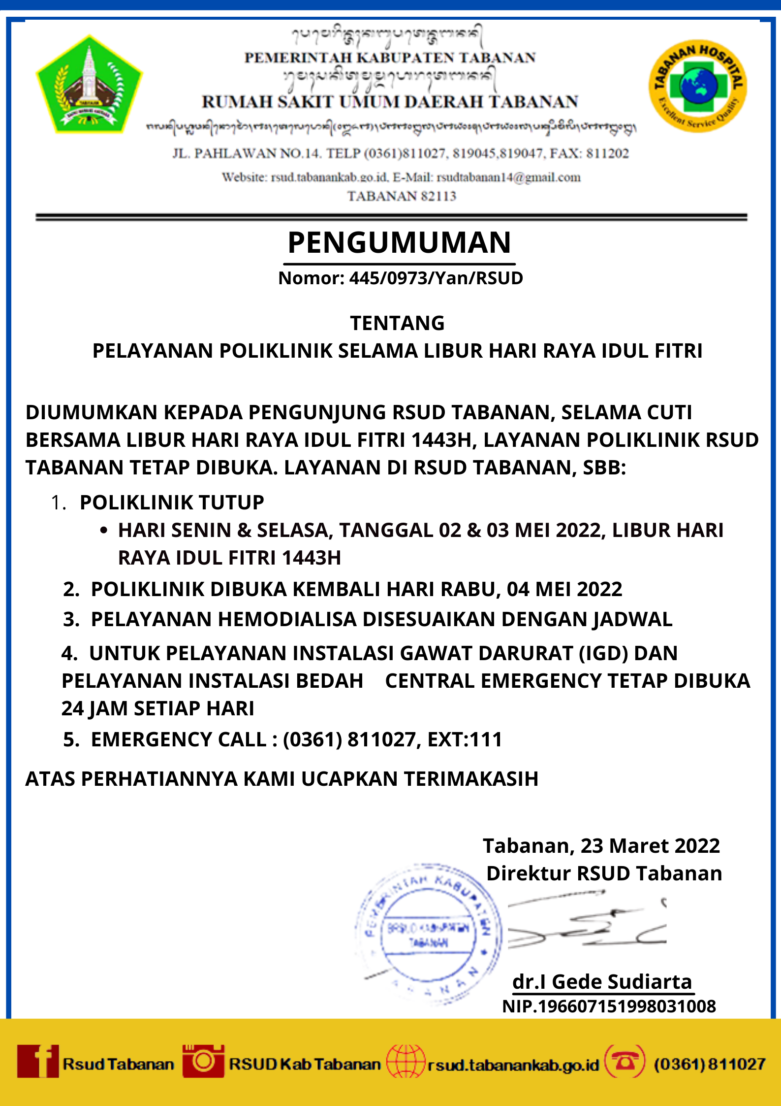 Pengumuman PELAYANAN POLIKLINIK DI RSUD TABANAN SELAMA LIBUR HARI RAYA IDUL FITRI 1443H Admin RSUD 25 April 2022 Continue Reading Previous PELAYANAN POLIKLINIK TUTUP SAAT HARI SUCI PAGERWESINext PENGUMUMAN PELAYANAN POLIKLINIK DI RSUD TABANAN SELAMA HARI RAYA GALUNGAN More Stories Pengumuman HARI ISRA MI’RAJ NABI MUHAMMAD SAW 1447 H dan HARI SUCI SIWARATRI POLIKLINIK RSUD TABANAN DI TUTUP Admin RSUD 22 January 2026 Pengumuman LAYANAN RSUD TABANAN SAAT PERAYAAN TAHUN BARU 2026 Admin RSUD 30 December 2025 Pengumuman PELAYANAN RSUD TABANAN SAAT HARI RAYA NATAL 2025 Admin RSUD 18 December 2025 Pengumuman PELAYANAN RSUD TABANAN SAAT HARI RAYA KUNINGANN Admin RSUD 26 November 2025 Pengumuman PELAYANAN RSUD TABANAN SAAT HARI RAYA GALUNGAN Admin RSUD 17 November 2025 Pengumuman PELAYANAN RSUD TABANAN SAAT LIBUR HARI SUCI PAGERWESI Admin RSUD 9 September 2025