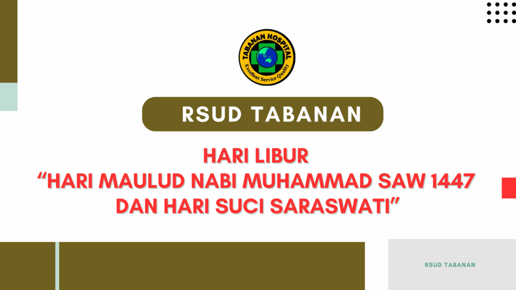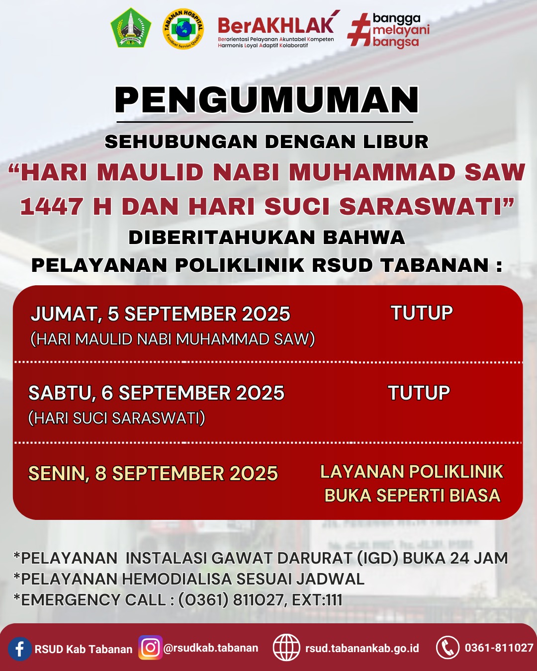 Sehubungan dengan Libur Hari Maulid Nabi Muhammad SAW 1447 H dan Hari Suci Saraswati, kami menginformasikan kepada pengunjung RSUD Tabanan bahwa Pelayanan Poliklinik RSUD Tabanan pada Jumat, 5 September 2025 dan Sabtu, 6 September 2025 TUTUP. Layanan Poliklinik buka kembali pada Senin, 8 September 2025.
