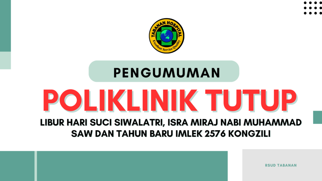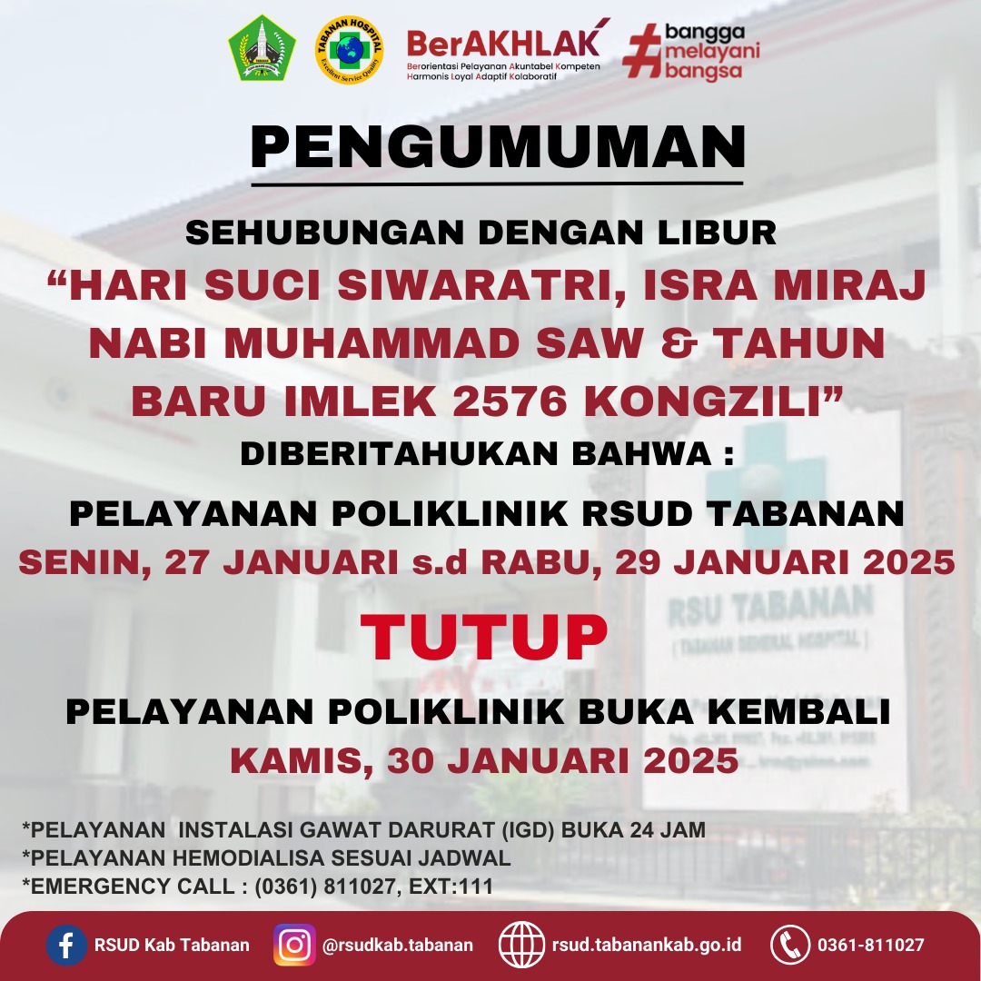 Sehubungan dengan Libur Hari Suci Siwaratri, Isra Miraj Nabi Muhammad SAW dan Tahun Baru Imlek 2576 Kongzili, kami menginformasikan kepada pengunjung RSUD Tabanan bahwa Pelayanan POLIKLINIK RSUD Tabanan pada Senin, 27 Januari 2025 sampai dengan Rabu, 29 Januari 2025 TUTUP.