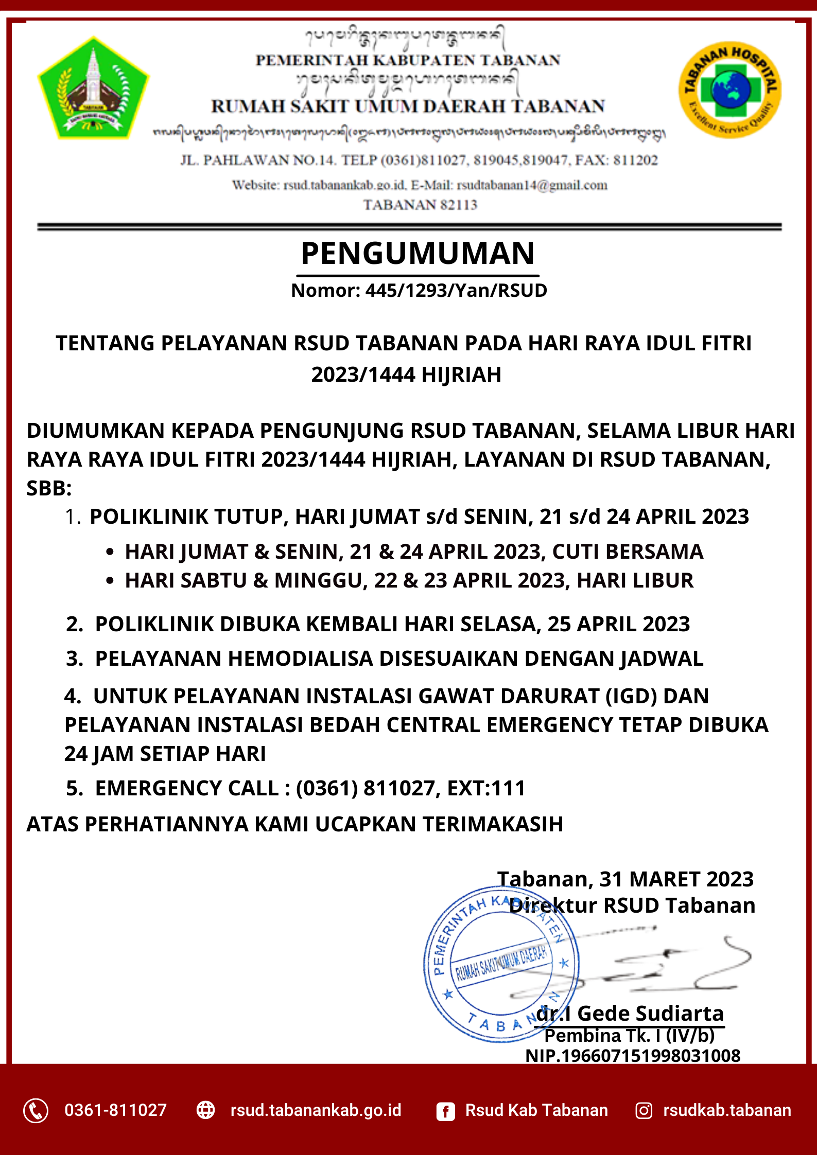 Merayakan Hari Raya Idul Fitri 2023/1444 Hijriah kami beritahukan bahwa Pelayanan RSUD Tabanan pada Hari Jumat dan Senin, 21 dan 24 April 2023, CUTI BERSAMA, Hari Sabtu, 22 April 2023, Hari Raya Idul Fitri 2023/1444 Hijriah. POLIKLINIK RAWAT JALAN TUTUP.