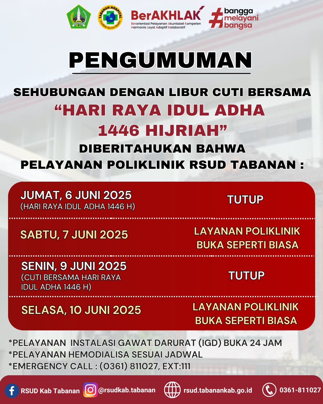 Pengumuman PELAYANAN RSUD TABANAN PADA SAAT HARI RAYA IDUL ADHA 1446 H Admin RSUD 3 June 2025 Continue Reading Previous PELAYANAN RSUD TABANAN SAAT MEMPERINGATI HARI KENAIKAN YESUS KRISTUSNext POLIKLINIK TUTUP PADA TAHUN BARU ISLAM, 1 MUHARRAM 1477 HIJRIAH More Stories Pengumuman PELAYANAN RSUD TABANAN SAAT HARI RAYA GALUNGAN Admin RSUD 17 November 2025 Pengumuman PELAYANAN RSUD TABANAN SAAT LIBUR HARI SUCI PAGERWESI Admin RSUD 9 September 2025 Pengumuman PELAYANAN POLIKLINIK RSUD TABANAN TUTUP PADA HARI MAULID NABI MUHAMMAD SAW 1447H DAN HARI SUCI SARASWATI Admin RSUD 2 September 2025 Pengumuman POLIKLINIK RSUD TABANAN TUTUP SAAT MEMPERINGATI HARI KEMERDEKAAN BANGSA INDONESIA KE 80 Admin RSUD 8 August 2025 Pengumuman POLIKLINIK TUTUP PADA TAHUN BARU ISLAM, 1 MUHARRAM 1477 HIJRIAH Admin RSUD 26 June 2025 Pengumuman PELAYANAN RSUD TABANAN SAAT MEMPERINGATI HARI KENAIKAN YESUS KRISTUS Admin RSUD 22 May 2025
