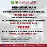 Pengumuman PELAYANAN RSUD TABANAN SAAT HARI NATAL DAN TAHUN BARU 2025 Admin RSUD 24 December 2024 Continue Reading Previous PENGUMUMAN SEHUBUNGAN DENGAN LIBUR NASIONAL “PILKADA SERENTAK TAHUN 2024” POLIKLINIK RSUD TABANAN TUTUPNext PELAYANAN POLIKLINIK RSUD TABANAN TUTUP SAAT HARI SUCI SIWALATRI, ISRA MIRAJ NABI MUHAMMAD SAW DAN TAHUN BARU IMLEK 2576 KONGZILI More Stories Pengumuman PELAYANAN RSUD TABANAN SAAT HARI RAYA GALUNGAN Admin RSUD 17 November 2025 Pengumuman PELAYANAN RSUD TABANAN SAAT LIBUR HARI SUCI PAGERWESI Admin RSUD 9 September 2025 Pengumuman PELAYANAN POLIKLINIK RSUD TABANAN TUTUP PADA HARI MAULID NABI MUHAMMAD SAW 1447H DAN HARI SUCI SARASWATI Admin RSUD 2 September 2025 Pengumuman POLIKLINIK RSUD TABANAN TUTUP SAAT MEMPERINGATI HARI KEMERDEKAAN BANGSA INDONESIA KE 80 Admin RSUD 8 August 2025 Pengumuman POLIKLINIK TUTUP PADA TAHUN BARU ISLAM, 1 MUHARRAM 1477 HIJRIAH Admin RSUD 26 June 2025 Pengumuman PELAYANAN RSUD TABANAN PADA SAAT HARI RAYA IDUL ADHA 1446 H Admin RSUD 3 June 2025