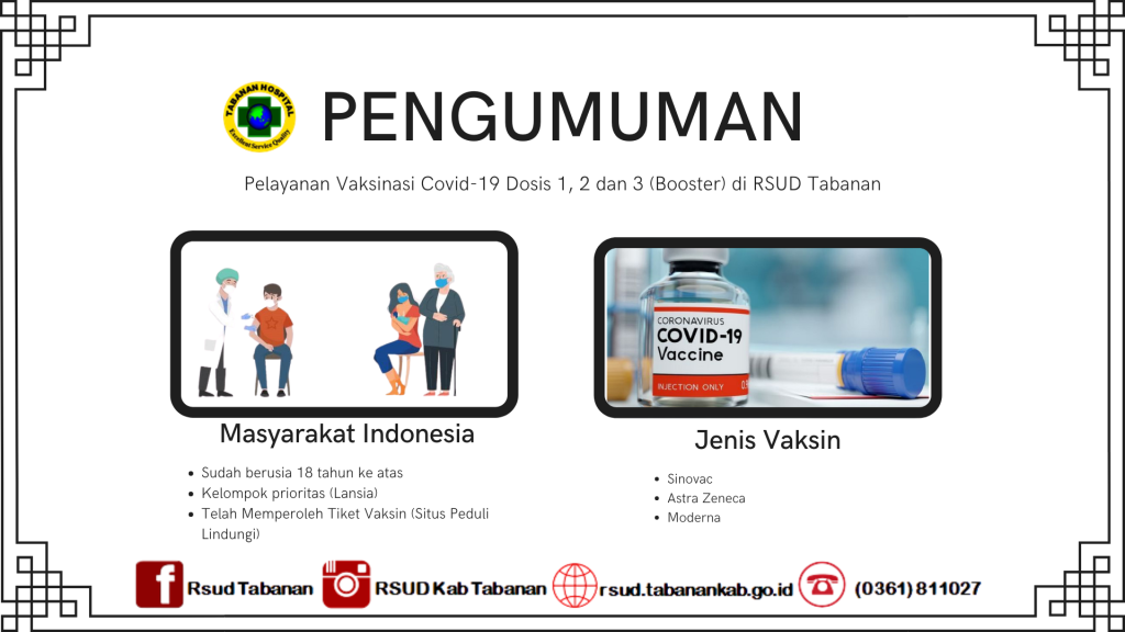 Pengumuman PELAYANAN VAKSINASI COVID-19 DOSIS 1, 2 dan 3 (BOOSTER) DI RSUD TABANAN Admin RSUD 22 January 2022 Continue Reading Previous BINCANG SEHAT SEHAT RUMAH KITA “YUK, KENALI RADANG USUS BUNTU LEBIH DALAM”Next LAYANAN POLIKLINIK RSUD TABANAN TUTUP SAAT HARI RAYA IMLEK 2573 More Stories Pengumuman HARI ISRA MI’RAJ NABI MUHAMMAD SAW 1447 H dan HARI SUCI SIWARATRI POLIKLINIK RSUD TABANAN DI TUTUP Admin RSUD 22 January 2026 Pengumuman LAYANAN RSUD TABANAN SAAT PERAYAAN TAHUN BARU 2026 Admin RSUD 30 December 2025 Pengumuman PELAYANAN RSUD TABANAN SAAT HARI RAYA NATAL 2025 Admin RSUD 18 December 2025 Pengumuman PELAYANAN RSUD TABANAN SAAT HARI RAYA KUNINGANN Admin RSUD 26 November 2025 Pengumuman PELAYANAN RSUD TABANAN SAAT HARI RAYA GALUNGAN Admin RSUD 17 November 2025 Pengumuman PELAYANAN RSUD TABANAN SAAT LIBUR HARI SUCI PAGERWESI Admin RSUD 9 September 2025