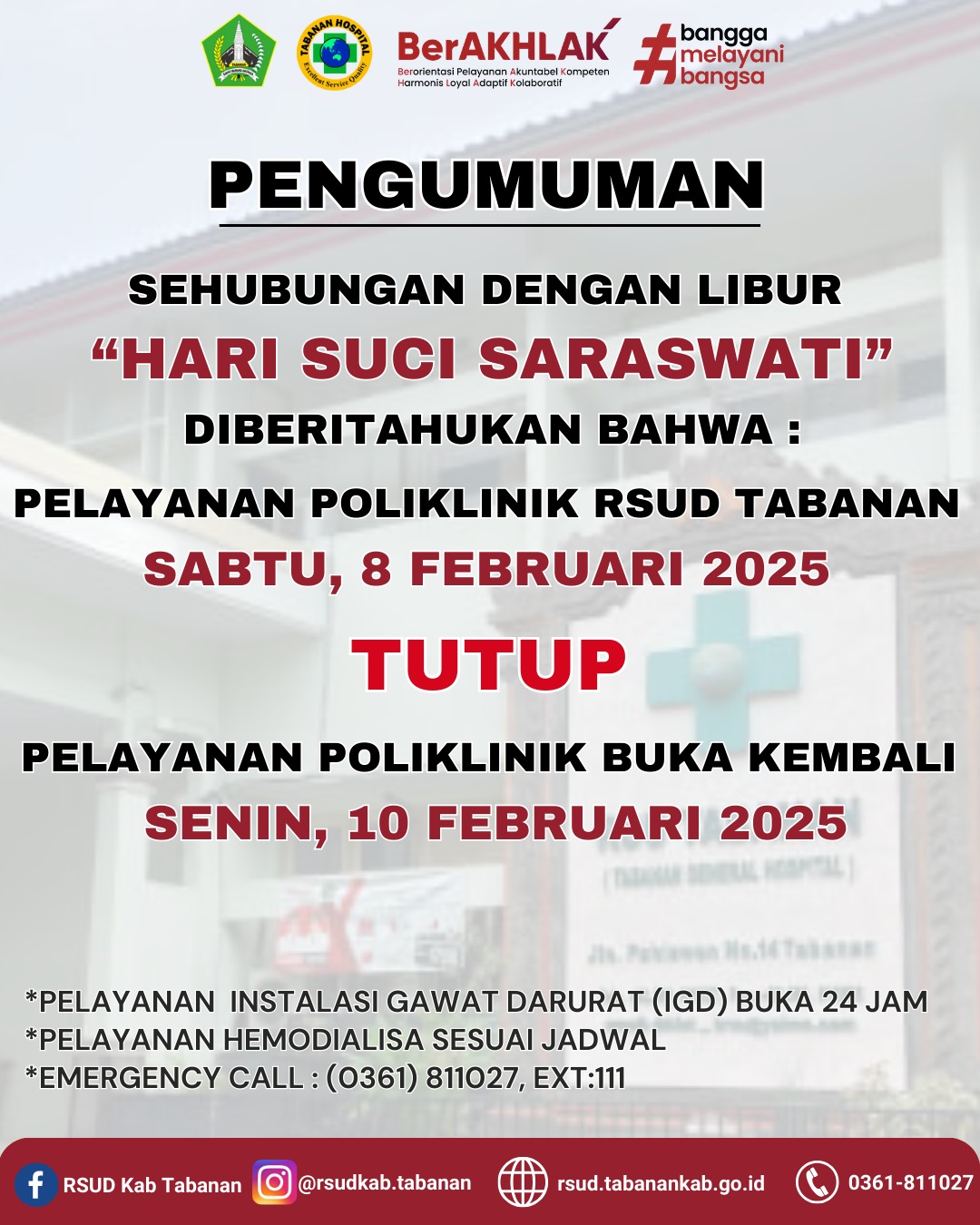 Pengumuman PENGUMUMAN “LAYANAN POLIKLINIK RSUD TABANAN TUTUP SAAT HARI SUCI SARASWATI” Admin RSUD 6 February 2025 Continue Reading Previous PELAYANAN POLIKLINIK RSUD TABANAN TUTUP SAAT HARI SUCI SIWALATRI, ISRA MIRAJ NABI MUHAMMAD SAW DAN TAHUN BARU IMLEK 2576 KONGZILINext POLIKLINIK TUTUP PADA SAAT HARI SUCI PAGERWESI More Stories Pengumuman PELAYANAN RSUD TABANAN SAAT HARI RAYA GALUNGAN Admin RSUD 17 November 2025 Pengumuman PELAYANAN RSUD TABANAN SAAT LIBUR HARI SUCI PAGERWESI Admin RSUD 9 September 2025 Pengumuman PELAYANAN POLIKLINIK RSUD TABANAN TUTUP PADA HARI MAULID NABI MUHAMMAD SAW 1447H DAN HARI SUCI SARASWATI Admin RSUD 2 September 2025 Pengumuman POLIKLINIK RSUD TABANAN TUTUP SAAT MEMPERINGATI HARI KEMERDEKAAN BANGSA INDONESIA KE 80 Admin RSUD 8 August 2025 Pengumuman POLIKLINIK TUTUP PADA TAHUN BARU ISLAM, 1 MUHARRAM 1477 HIJRIAH Admin RSUD 26 June 2025 Pengumuman PELAYANAN RSUD TABANAN PADA SAAT HARI RAYA IDUL ADHA 1446 H Admin RSUD 3 June 2025