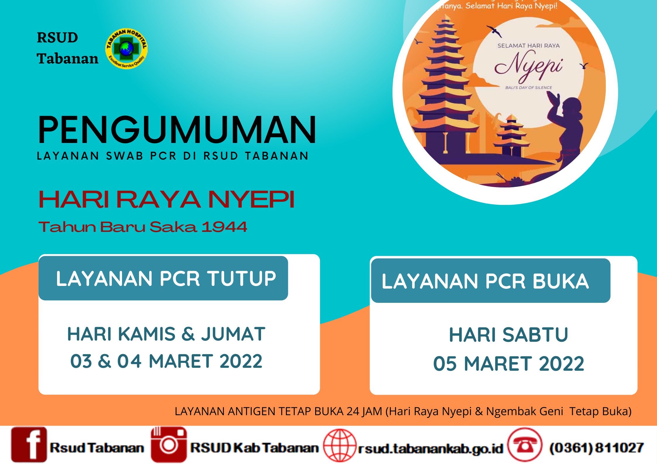 Pengumuman PENGUMUMAN LAYANAN SWAB PCR DAN ANTIGEN SAAT HARI RAYA NYEPI TAHUN BARU SAKA 1944 Admin RSUD 22 February 2022 Continue Reading Previous LAYANAN POLIKLINIK RSUD TABANAN TUTUP SAAT HARI RAYA IMLEK 2573Next PENGUMUMAN PELAYANAN POLIKLINIK SAAT HARI ISRA MI’RAJ More Stories Pengumuman HARI ISRA MI’RAJ NABI MUHAMMAD SAW 1447 H dan HARI SUCI SIWARATRI POLIKLINIK RSUD TABANAN DI TUTUP Admin RSUD 22 January 2026 Pengumuman LAYANAN RSUD TABANAN SAAT PERAYAAN TAHUN BARU 2026 Admin RSUD 30 December 2025 Pengumuman PELAYANAN RSUD TABANAN SAAT HARI RAYA NATAL 2025 Admin RSUD 18 December 2025 Pengumuman PELAYANAN RSUD TABANAN SAAT HARI RAYA KUNINGANN Admin RSUD 26 November 2025 Pengumuman PELAYANAN RSUD TABANAN SAAT HARI RAYA GALUNGAN Admin RSUD 17 November 2025 Pengumuman PELAYANAN RSUD TABANAN SAAT LIBUR HARI SUCI PAGERWESI Admin RSUD 9 September 2025