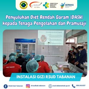 Semeton RSUD Tabanan, Jumat 6 September 2024 PKRS RSUD Tabanan dan Tim Instalasi Gizi mengadakan kegiatan Penyuluhan Diet Rendah Garam (DASH) kepada Tenaga Pengolahan dan Pramusaji Instalasi Gizi RSUD Tabanan. Adapun narasumber dalam kegiatan ini yaitu Gusti Putu Yadnya, S.ST. Diet rendah garam atau diet DASH (Dietary Approaches to Stop Hypertension adalah diet yang membatasi asupan garam dan menyarankan konsumsi makanan rendah lemak jenuh, kolesterol, dan lemak total, serta meningkatkan konsumsi buah dan sayur dengan jumlah porsi 4-5 porsi/hari, produk susu tanpa lemak dan rendah lemak, gandum utuh, dan kacang-kacangan.
