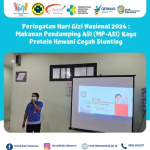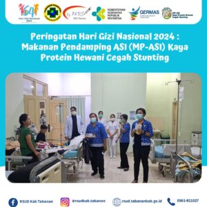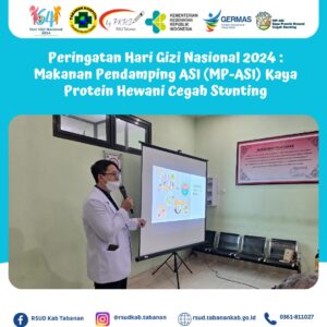 Kamis, 25 Januari 2024 tim PKRS dan Instalasi Gizi RSUD Tabanan melaksanakan penyuluhan kesehatan untuk memperingati Hari Gizi Nasional dengan pembicara dokter spesialis gizi klinis yaitu dr. I Putu Prayoga Ratha, SpGK dan ahli gizi RSUD Tabanan Gusti Putu Yadnya, S.ST dengan topik “Makanan Pendamping ASI (MP-ASI) Kaya Protein Hewani Cegah Stunting”. Penyuluhan dilaksanakan di Ruang Tunggu Poliklinik dan Ruang Anggrek (Ruang Perawatan Anak) RSUD Tabanan. Selain penyuluhan, instalasi gizi juga membagikan bingkisan kepada pasien anak sekaligus melakukan edukasi terkait stunting.