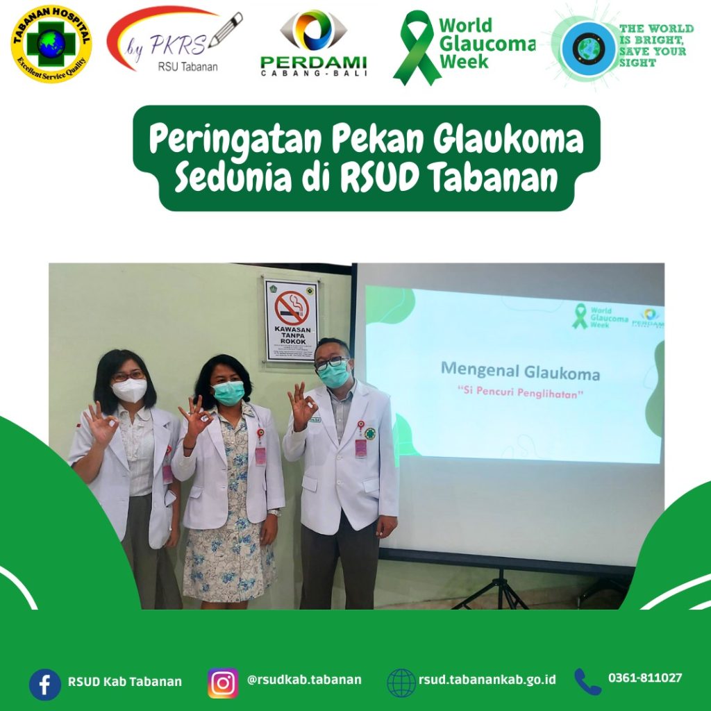 Semeton RSUD Tabanan, tanggal 27 Maret 2023 tim PKRS melaksanakan kegiatan penyuluhan dalam rangka memperingati Pekan Glaukoma Sedunia bersama Dokter Spesialis Mata RSUD Tabanan yaitu dr. I Gede Rustama Putra, M.Biomed, Sp.M ; dr. Ni Wayan Sedani, M.Biomed, Sp.M ; dan dr. Cintya Dewi, M.Biomed, Sp.M. Glaukoma merupakan penyebab kebutaan kedua di dunia termasuk Indonesia. Seiring dengan meningkat nya usia harapan hidup jumlah kasus glaukoma diduga akan terus bertambah. Glaukoma adalah kerusakan saraf mata akibat meningkatnya tekanan pada bola mata. Meningkatnya tekanan bola mata ini terjadi akibat gangguan pada sistem aliran cairan mata. seseorang dengan kondisi ini dapat merasakan gejala berupa gangguan penglihatan, nyeri pada mata, hingga sakit kepala. De teksi dini dan penanganan yang tepat dapat mencegah terjadinya kebutaan permanen pada penderita glaukoma. Dalam paparan narasumber disampaikan bahwa jika telah mengidap glaucoma maka tidak bisa untuk sembuh sehingga penting melakukan pemeriksaan mata jika terjadi keluhan pada mata. Pemeriksaan mata juga penting agar kita tidak sembarangan dalam membeli obat tetes mata dimana penggunaan obat tetes mata yang tidak tepat juga dapat menjadi factor risiko glaukoma.