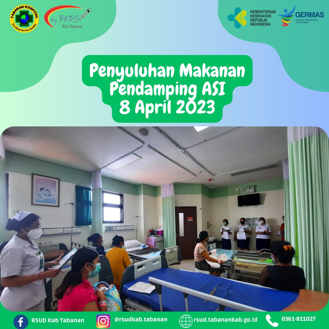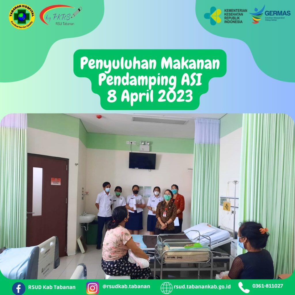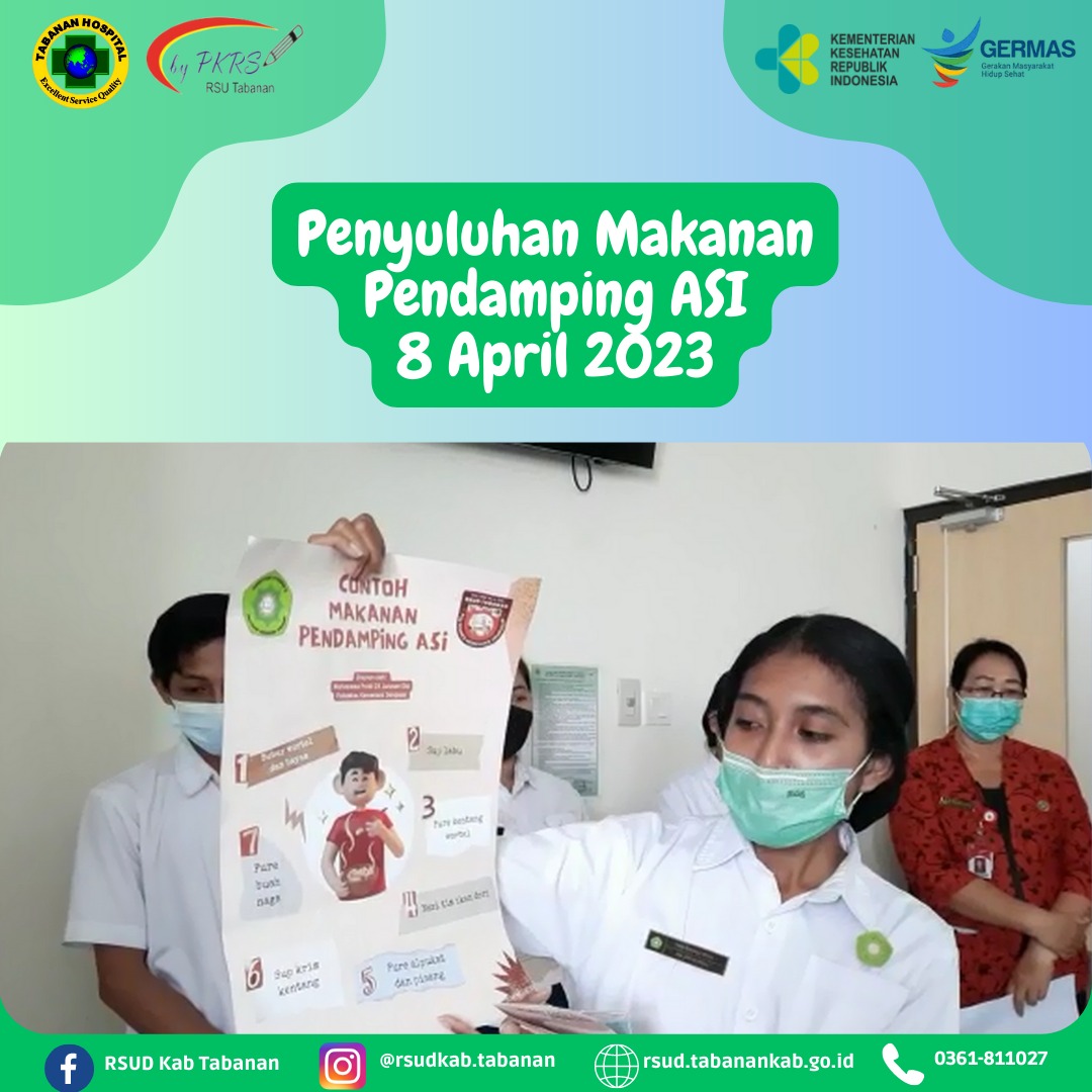 Semeton RSUD Tabanan, Sabtu 8 April 2023 PKRS melaksanakan kegiatan penyuluhan Pentingnya Makanan Pendamping ASI pada Anak di Ruang Rawat Inap Kemuning. Narasumber dalam kegiatan ini adalah Bidan Sri Utami, S.ST beserta mahasiswa Program Studi Gizi Poltekkes Denpasar di damping Ahli Gizi RSUD Tabanan. Makanan Pendamping ASI atau MPASI adalah makanan atau minuman yang mengandung zat gizi yang diberikan kepada bayi atau anak usia 6-24 bulan yang berguna memenuhi kebutuhan gizi selain ASI. Di usia 6 bulan bayi memerlukan gizi lebih untuk mencegah terjadinya gizi buruk dan gizi kurang. Pemberian MPASI juga guna mengembangkan kemampuan bayi untuk mengunyah dan menelan. Narasumber juga menyampaikan jenis dan bahan MPASI yang baik. Syarat pemberian MPASI pada anak yaitu tepat waktu, mengandung cukup energy protein dan micronutrien, aman dalam penyimpanan penyiapan dan pemberian makanan, serta tepat cara pemberian MPASI.