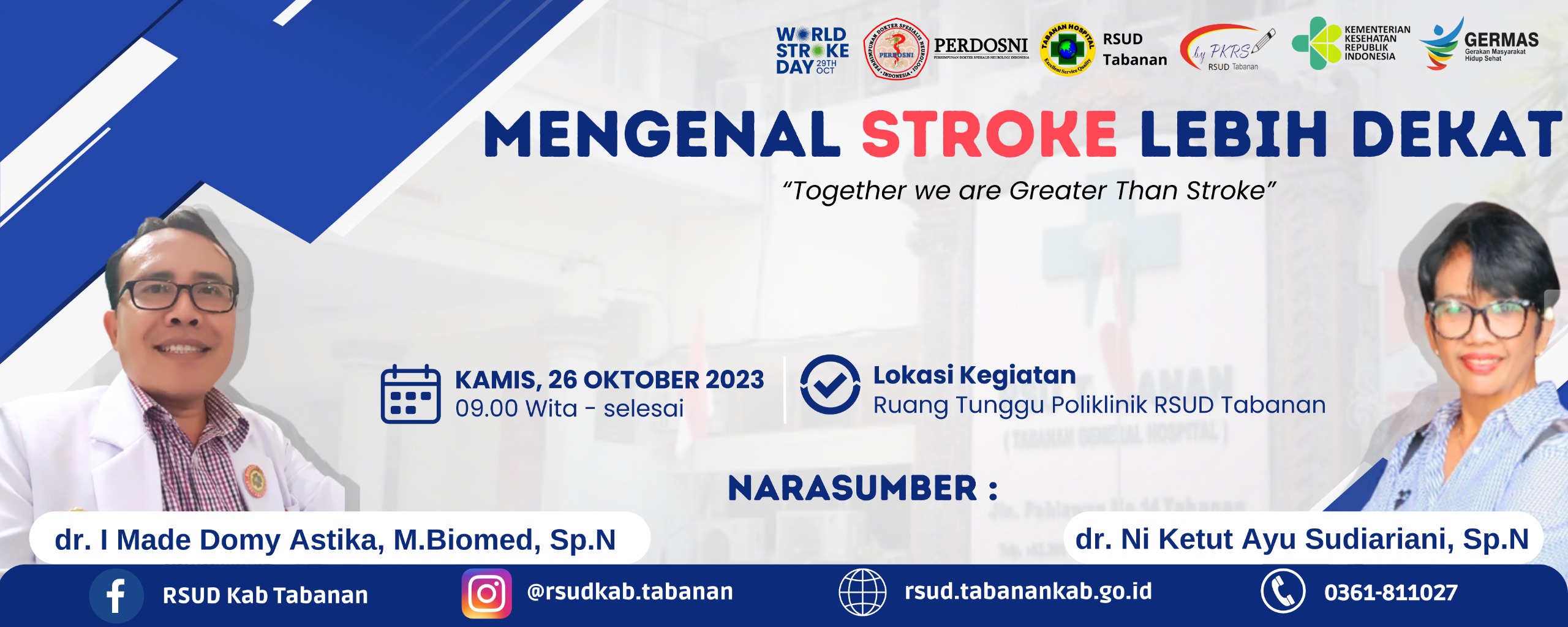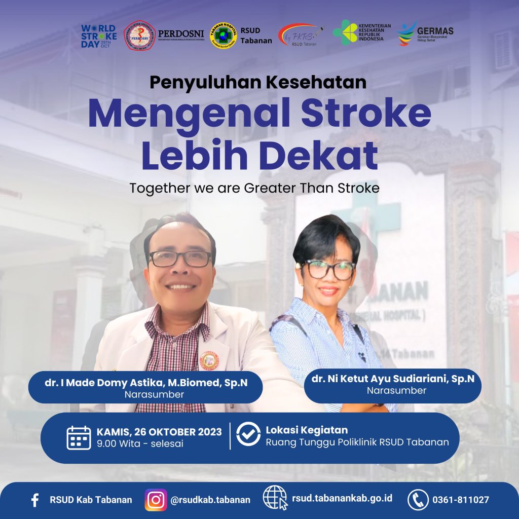 emeton RSUD Tabanan, Dalam rangka memperingati Hari Stroke Sedunia PKRS RSUD Tabanan dan PERDOSNI Cabang Bali akan melaksanakan Penyuluhan Kesehatan dengan topik “Mengenal Stroke Lebih Dekat”. Adapun narasumber pada kegiatan penyuluhan ini adalah dokter spesialis neurologi RSUD Tabanan yaitu dr. Ni Ketut Ayu Sudiariani, Sp.N dan dr. I Made Domy Astika, M.Biomed, Sp.N.