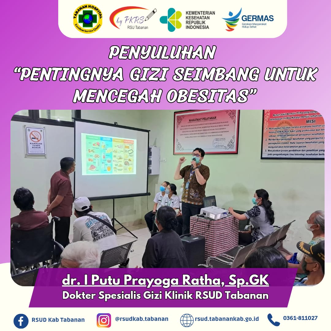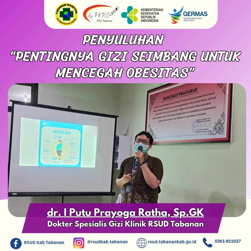 Kamis, 6 Maret 2025 PKRS dan Instalasi Gizi RSUD Tabanan melaksanakan kegiatan penyuluhan “Pentingnya Gizi Seimbang untuk Mencegah Obesitas “ dalam rangka memperingati Hari Obesitas Sedunia 2025. Adapun narasumber dalam penyuluhan hari ini adalah dr. I Putu Prayoga Ratha, Sp.GK dan Gusti Putu Yadnya, S.ST. Obesitas merupakan kelebihan berat badan akibat penumpukan lemak yang berlebihan yang disebabkan oleh ketidakseimbangan asupan energi dengan energi yang digunakan dalam waktu lama. Obesitas dipengaruhi oleh konsumsi makanan yang banyak mengandung lemak, gula dan kurang serat, jadwal makan yang tidak teratur, makan dengan porsi besar dan kurangnya aktifitas fisik. Kondisi ini berdampak negatif bagi kesehatan karena obesitas dapat memicu penyakit jantung koroner, stroke, diabetes mellitus, hipertensi, dan lain sebagainya. Obesitas dapat dicegah dengan konsumsi makanan bergizi seimbang, melakukan aktifitas fisik minimal 30 menit/hari, rutin menimbang berat badan dan kurangi penggunaan minyak pada masakan (memasak sebaiknya dilakukan dengan cara merebus, mengukus, memanggang atau menumis makanan). Adapun 10 pesan gizi seimbang untuk mencegah obesitas yaitu syukuri dan nikmati anekaragam jenis makanan, banyak makan sayuran dan cukup buah-buahan, konsumsi lauk pauk berprotein tinggi, konsumsi aneka ragam makanan pokok, batasi konsumsi makanan manis, asin dan berlemak, biasakan sarapan pagi sebelum beraktivitas, minum air putih yang cukup dan aman, biasakan baca label pada kemasan makanan, biasakan cuci tangan dengan sabun dan air mengalir, berolahragalah secara teratur dan jaga berat badan normal