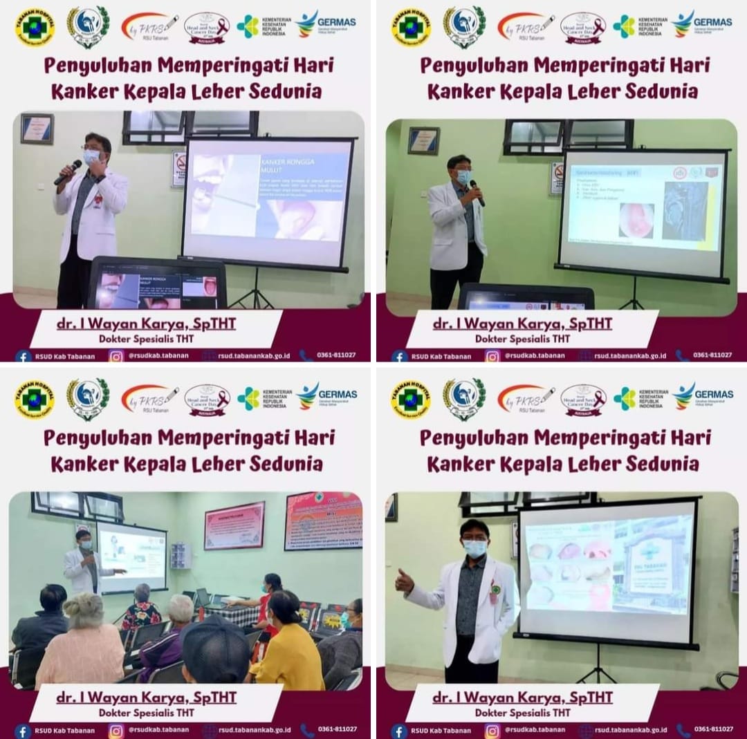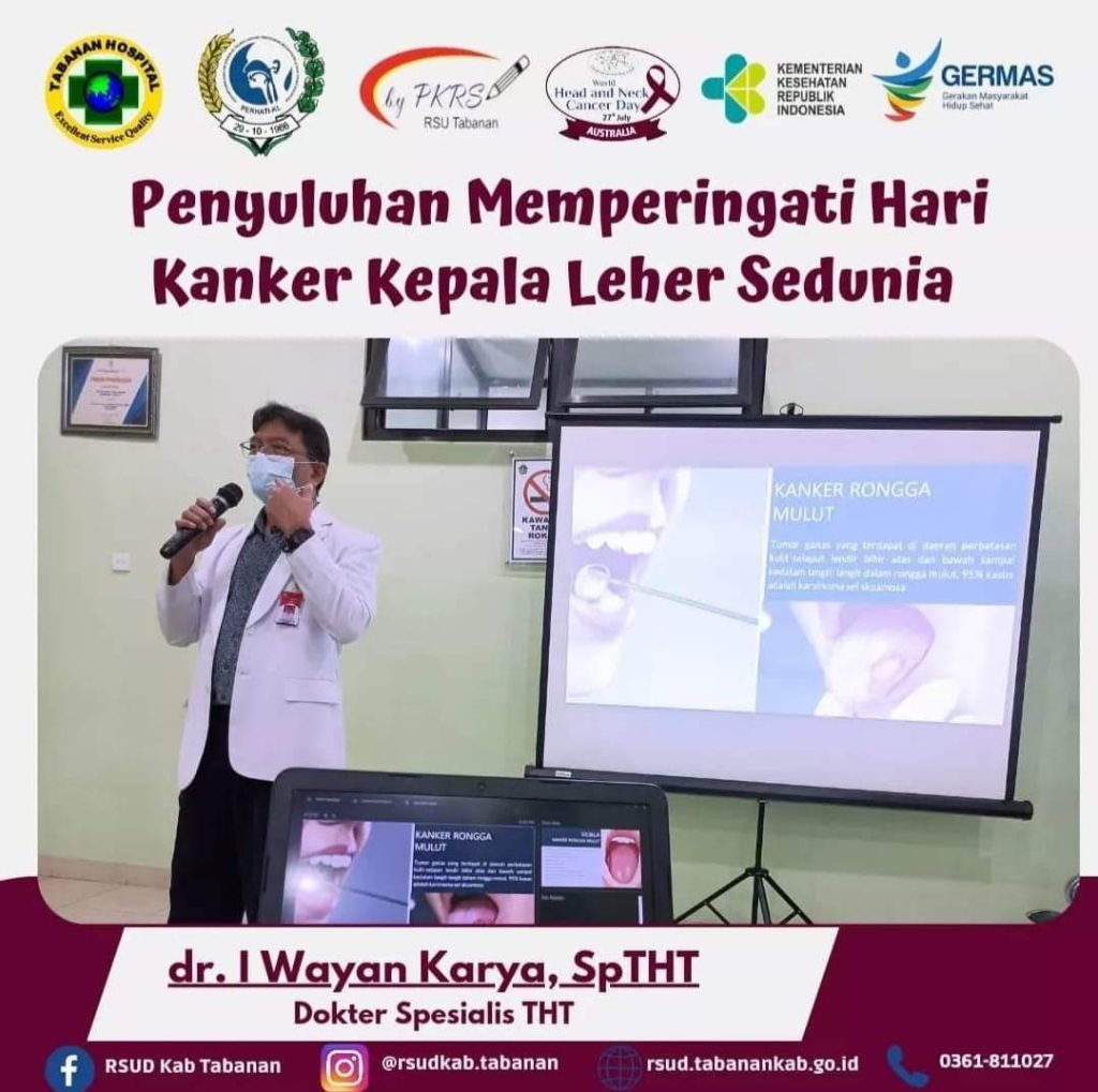 Kamis, 27 Juli 2023 PKRS RSUD Tabanan menyelenggarakan penyuluhan Mengenal Deteksi Dini Kanker Kepala Leher dengan pembicara dr. I Wayan Karya, Sp.THT bertempat di Ruang Tunggu Poliklinik. Hari Kanker Kepala dan Leher Sedunia diperingati pada tanggal 27 Juli setiap tahunnya. Ini adalah kesempatan untuk meningkatkan kesadaran tentang kanker kepala dan leher di masyarakat umum. Masyarakat umum perlu mengetahui tentang kanker kepala leher karena kanker ini memiliki gejala tersembunyi, kesulitan mendeteksi sehingga pasien sering datang ke fasilitas kesehatan ketika sudah stadium lanjut, pengobatan mahal dan waktu lama serta prognosis memburuk.