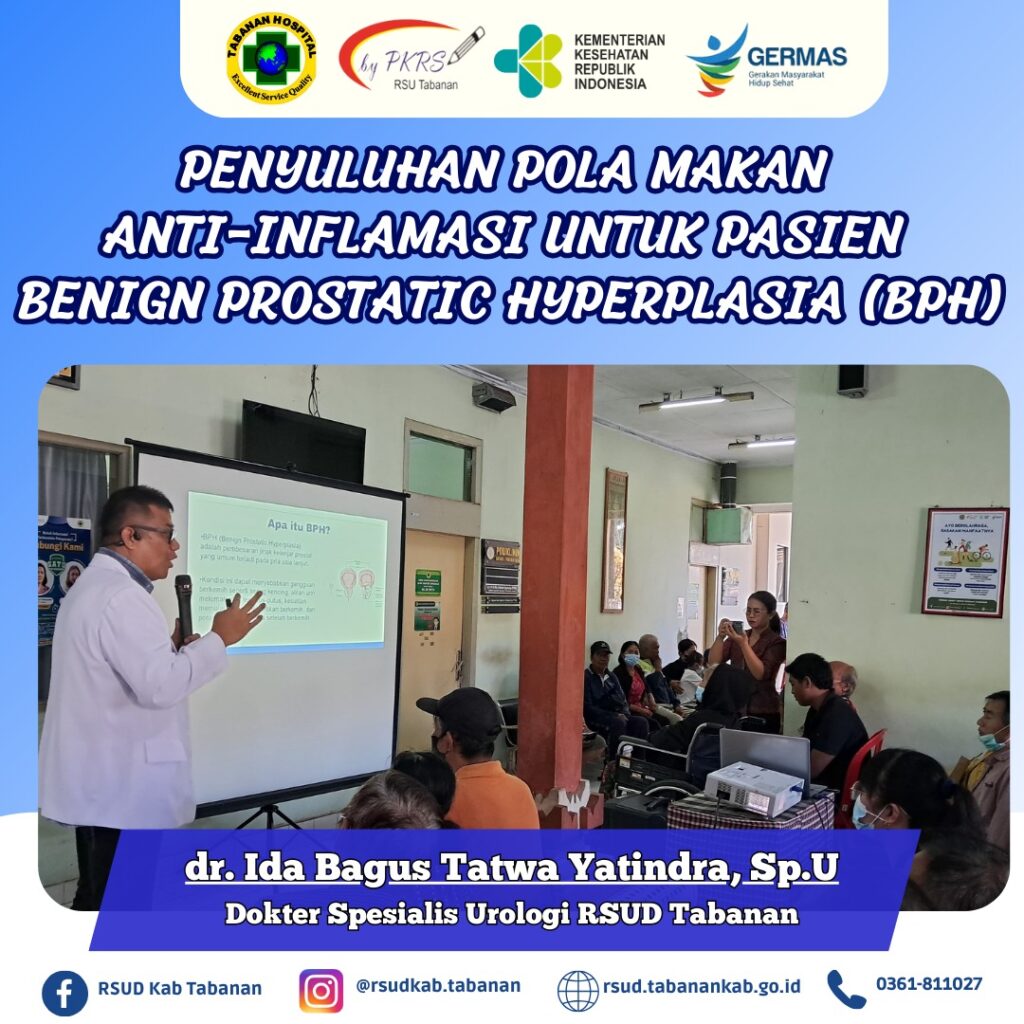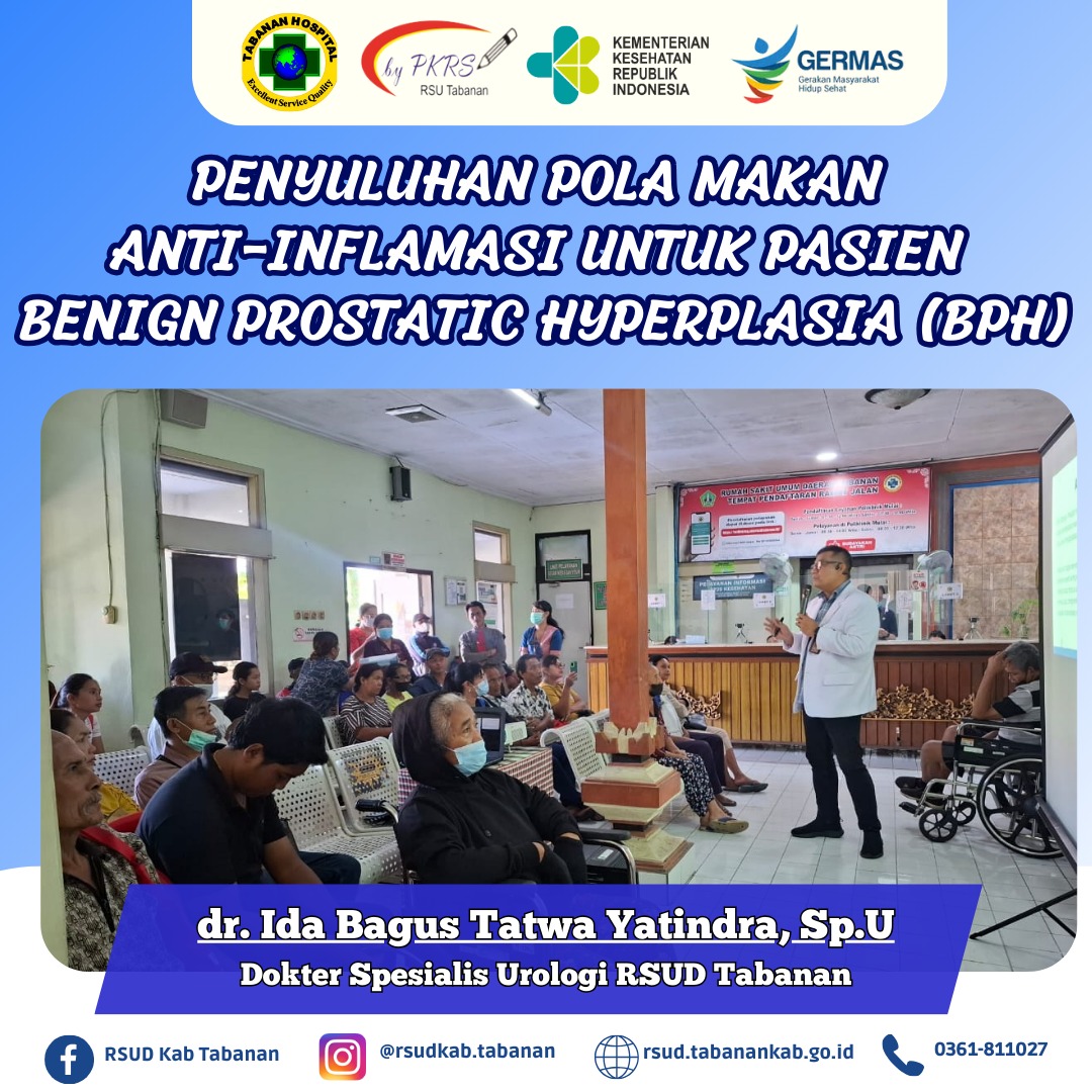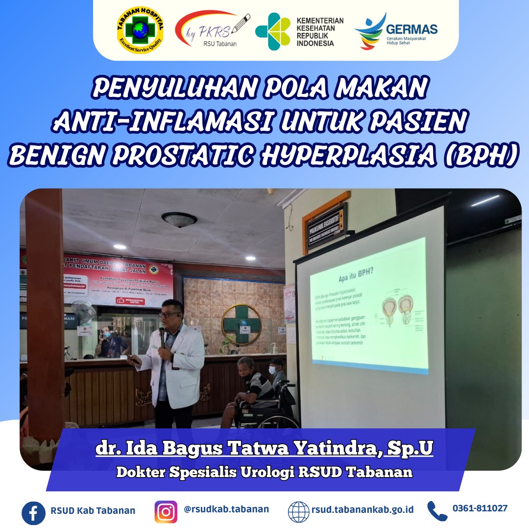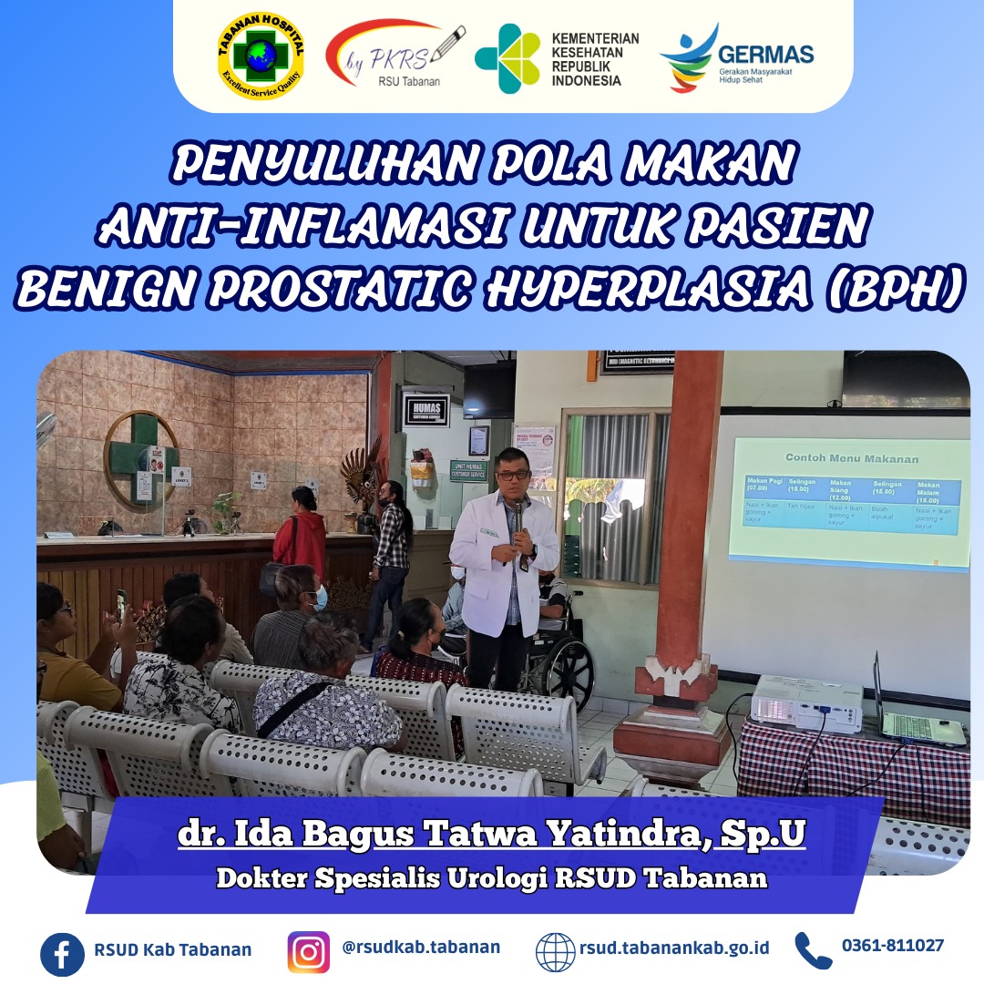 Rabu, 26 Februari 2025 PKRS RSUD Tabanan melaksanakan kegiatan Penyuluhan terkait Pola Makan Anti-Inflamasi untuk Pasien Benign Prostatic Hyperplasia (BPH). Adapun narasumber dalam kegiatan ini yaitu dr. Ida Bagus Tatwa Yatindra, Sp.U.