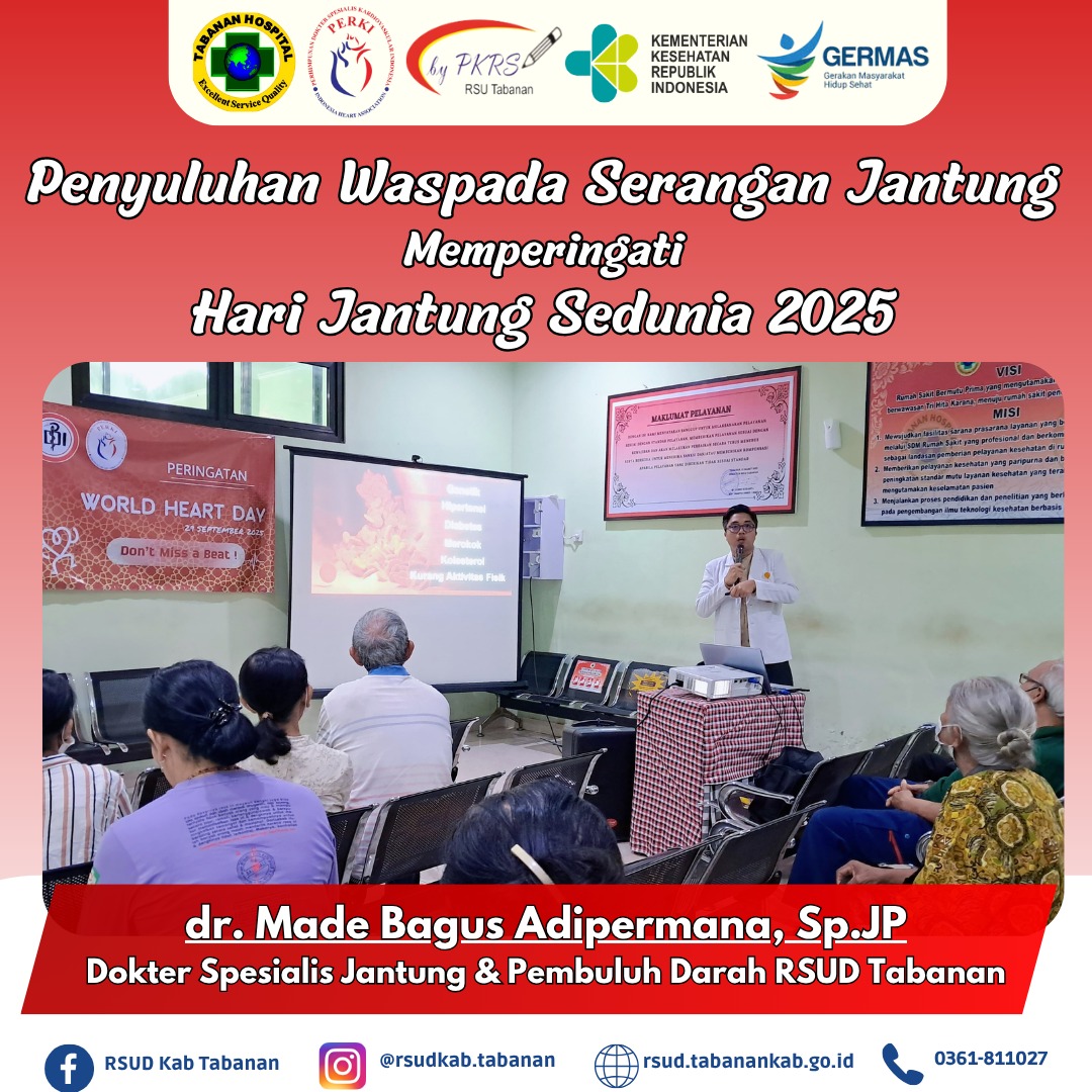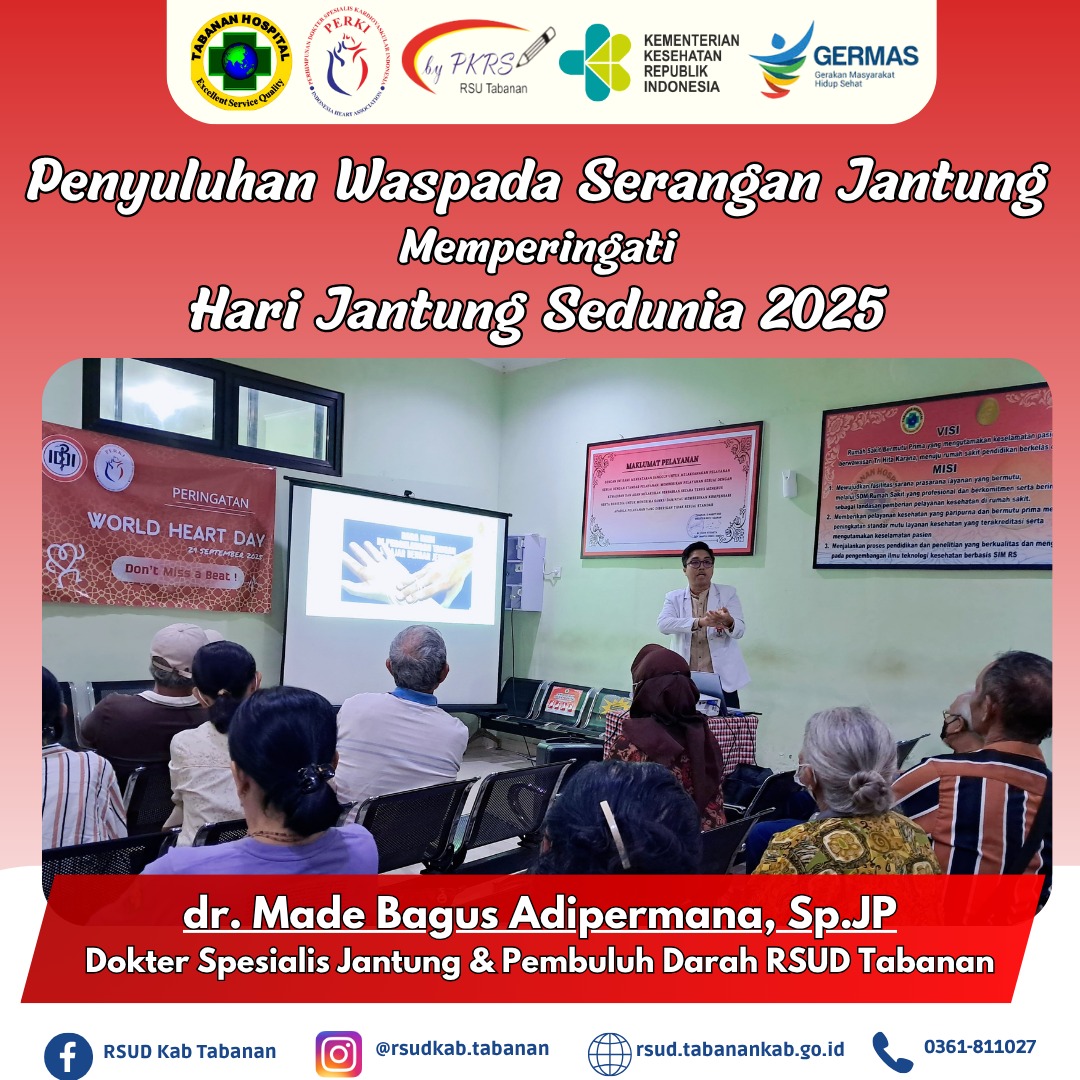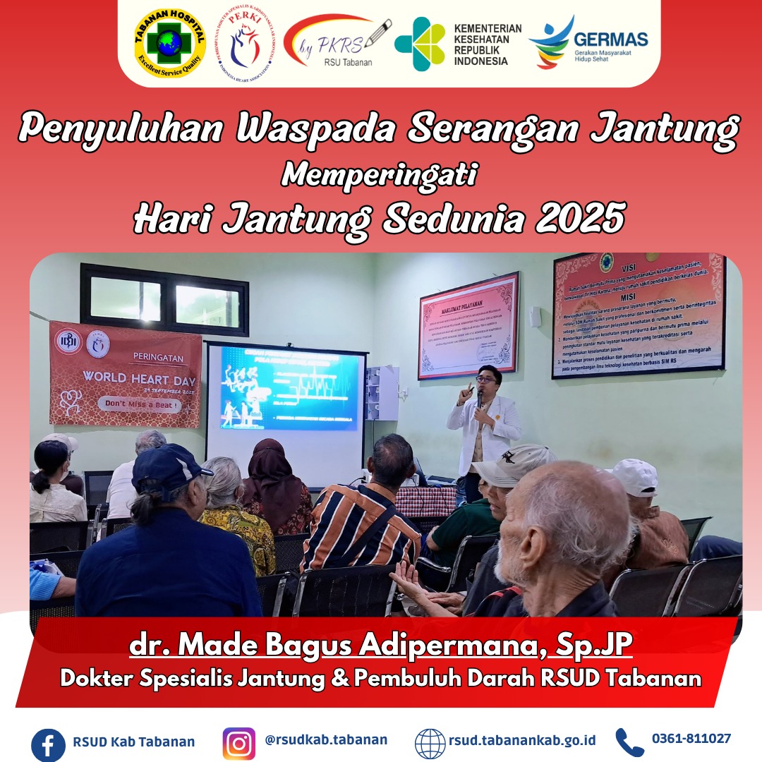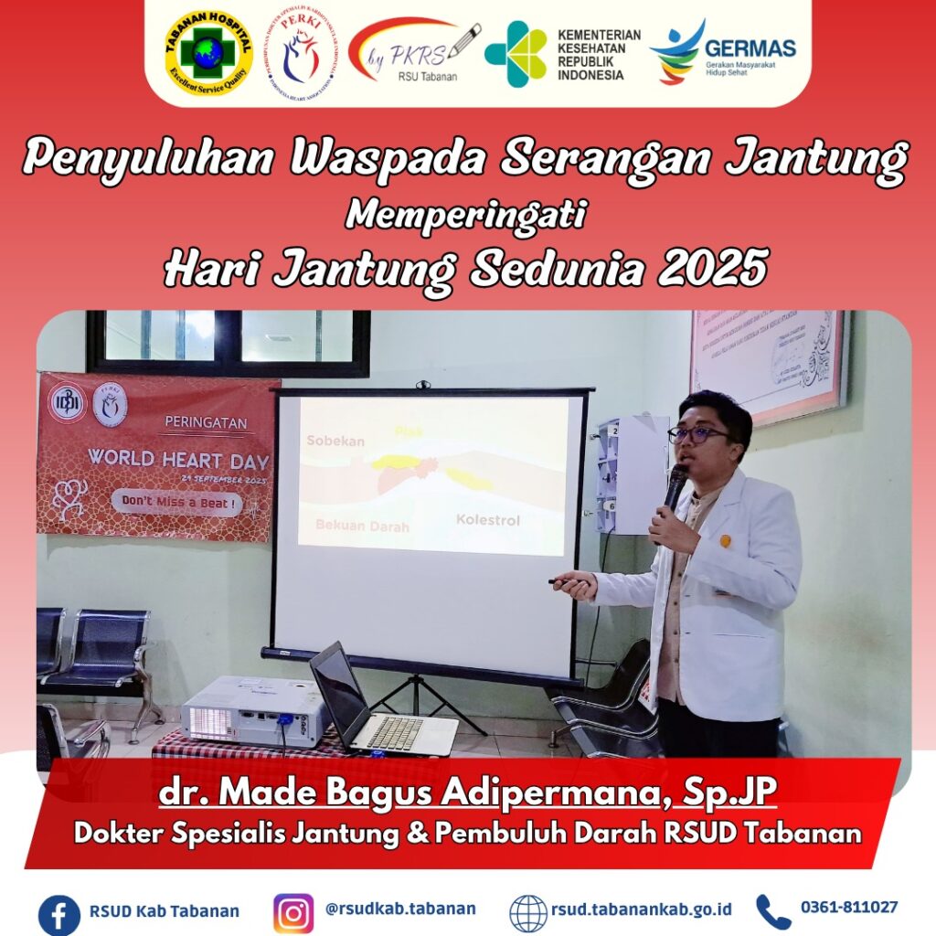 Rabu, 30 Juli 2025 – Dalam rangka memperingati Hari Jantung Sedunia 2025, PKRS dengan SMF Jantung dan Pembuluh Darah RSUD Tabanan menyelenggarakan kegiatan penyuluhan kesehatan “Waspada Serangan Jantung”. Kegiatan ini bertujuan untuk meningkatkan kesadaran masyarakat tentang pentingnya menjaga kesehatan jantung dan mencegah penyakit kardiovaskular sejak dini. Adapun narasumber dalam penyuluhan ini adalah dr. Made Bagus Adipermana, Sp.JP