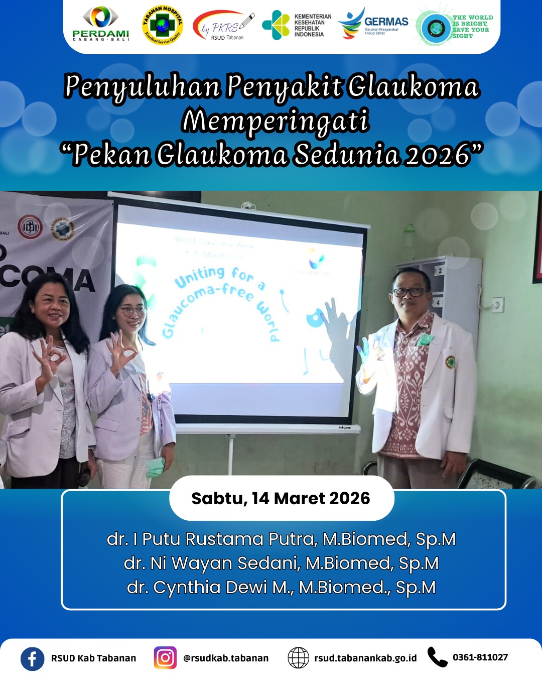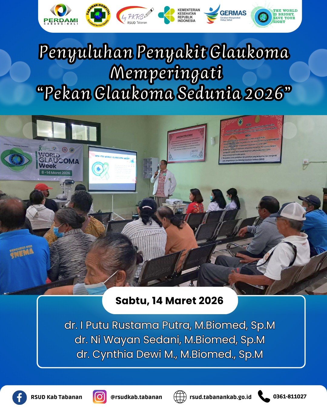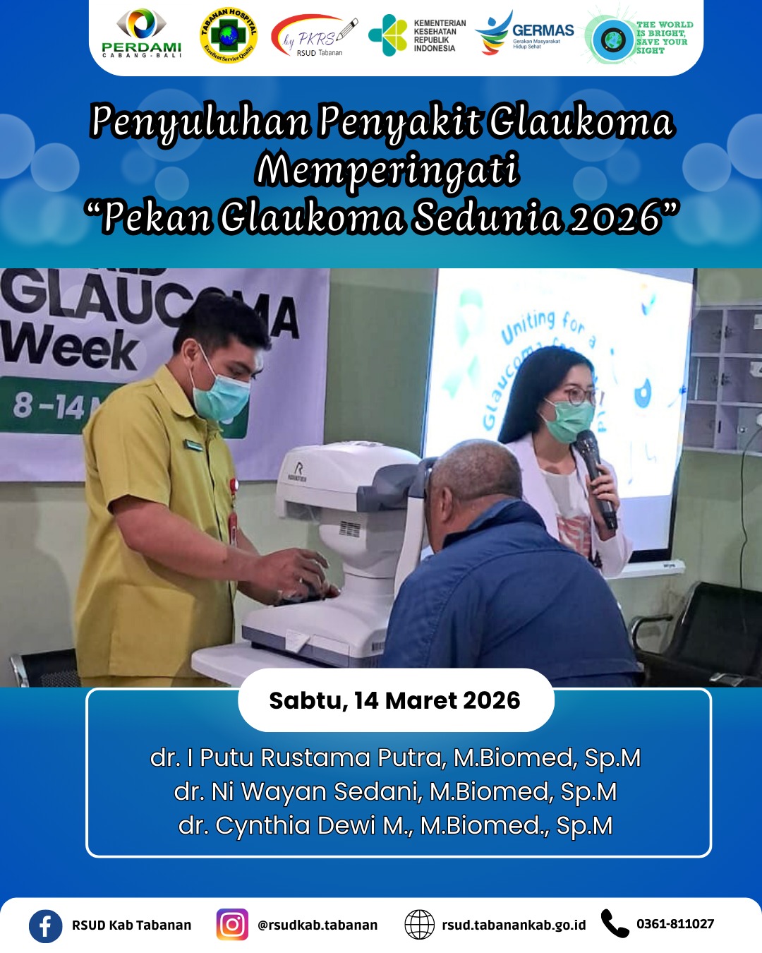 Sabtu, 14 Maret 2026 Tim PKRS bersama dokter spesialis mata di Poliklinik Mata menyelenggarakan penyuluhan kesehatan tentang glaukoma dalam rangka memperingati Pekan Glaukoma Sedunia Tahun 2026. Selain penyuluhan kesehatan, juga dilaksanakan pemeriksaan tekanan bola mata bagi pasien dan pengunjung RSUD Tabanan untuk deteksi dini penyakit glaukoma.