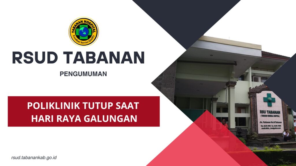Sehubungan dengan Libur Hari Raya Galungan, kami menginformasikan kepada pengunjung RSUD Tabanan bahwa Pelayanan POLIKLINIK RSUD Tabanan pada Selasa, 22 April 2025 sampai dengan Kamis, 24 April 2025 TUTUP.