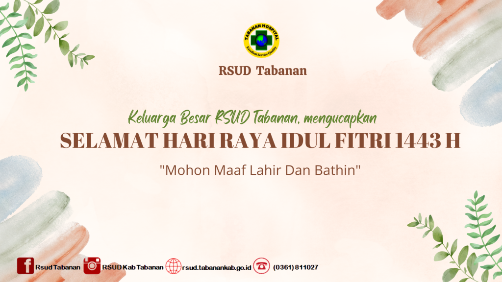 Berita Selamat Hari Raya Idul Fitri 1443H/2022M Admin RSUD 25 April 2022 Continue Reading Previous UCAPAN HARI SUCI PAGERWESINext PELATIHAN BASIC TRAUMA AND CARDIAC LIFE SUPPORT (BT & CLS) BAGI TENAGA PERAWAT DI RSUD TABANAN More Stories Berita Kegiatan PromKes PENYULUHAN KESEHATAN “EDUKASI PASIEN PENYAKIT UROLOGI KRONIK” Admin RSUD 26 January 2026 Berita KELUARGA BESAR RSUD TABANAN MENGUCAPKAN RAHAJENG RAHINA SUCI SIWARATRI Admin RSUD 22 January 2026 Berita KELUARGA BESAR RSUD TABANAN MENGUCAPKAN SELAMAT HARI ISRA MIRAJ NABI MUHAMMAD SAW 1447 H Admin RSUD 22 January 2026 Berita KELUARGA BESAR RSUD TABANAN MENGUCAPKAN SELAMAT HARI NATAL 2025 DAN TAHUN BARU 2026 Admin RSUD 18 December 2025 Berita PUNCAK PERAYAAN HUT RSUD TABANAN Ke-72 Admin RSUD 26 November 2025 Berita KELUARGA BESAR RSUD TABANAN MENGUCAPKAN SELAMAT HARI PUPUTAN MARGARANA Admin RSUD 17 November 2025