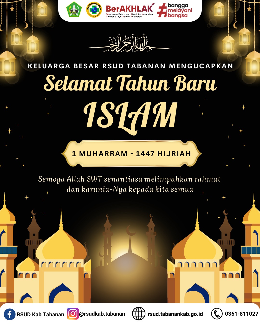 Keluarga Besar RSUD Tabanan mengucapkan Selamat Memperingati Tahun Baru Islam 1 Muharram 1447 Hijriah. Semoga Allah SWT senantiasa melimpahkan rahmat dan karunia-Nya kepada kita semua.