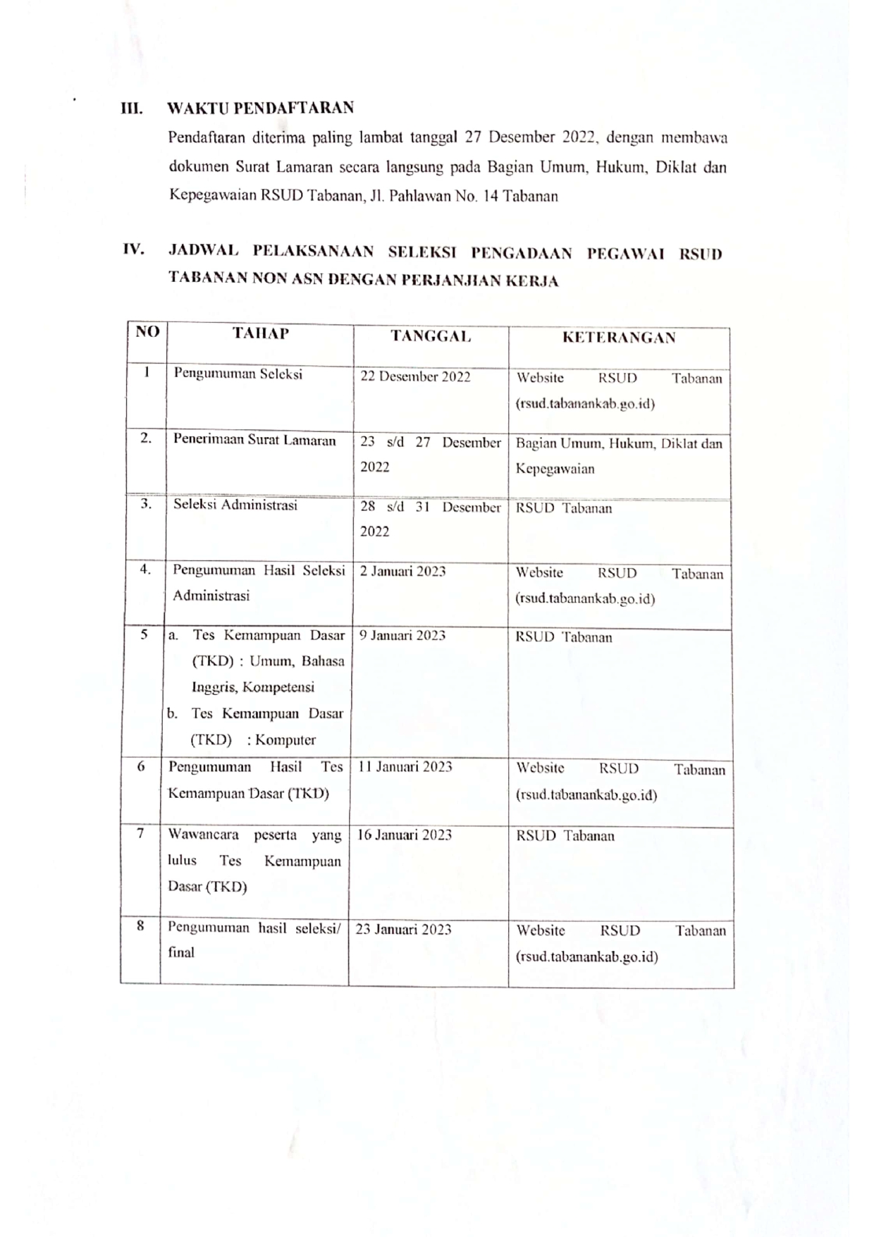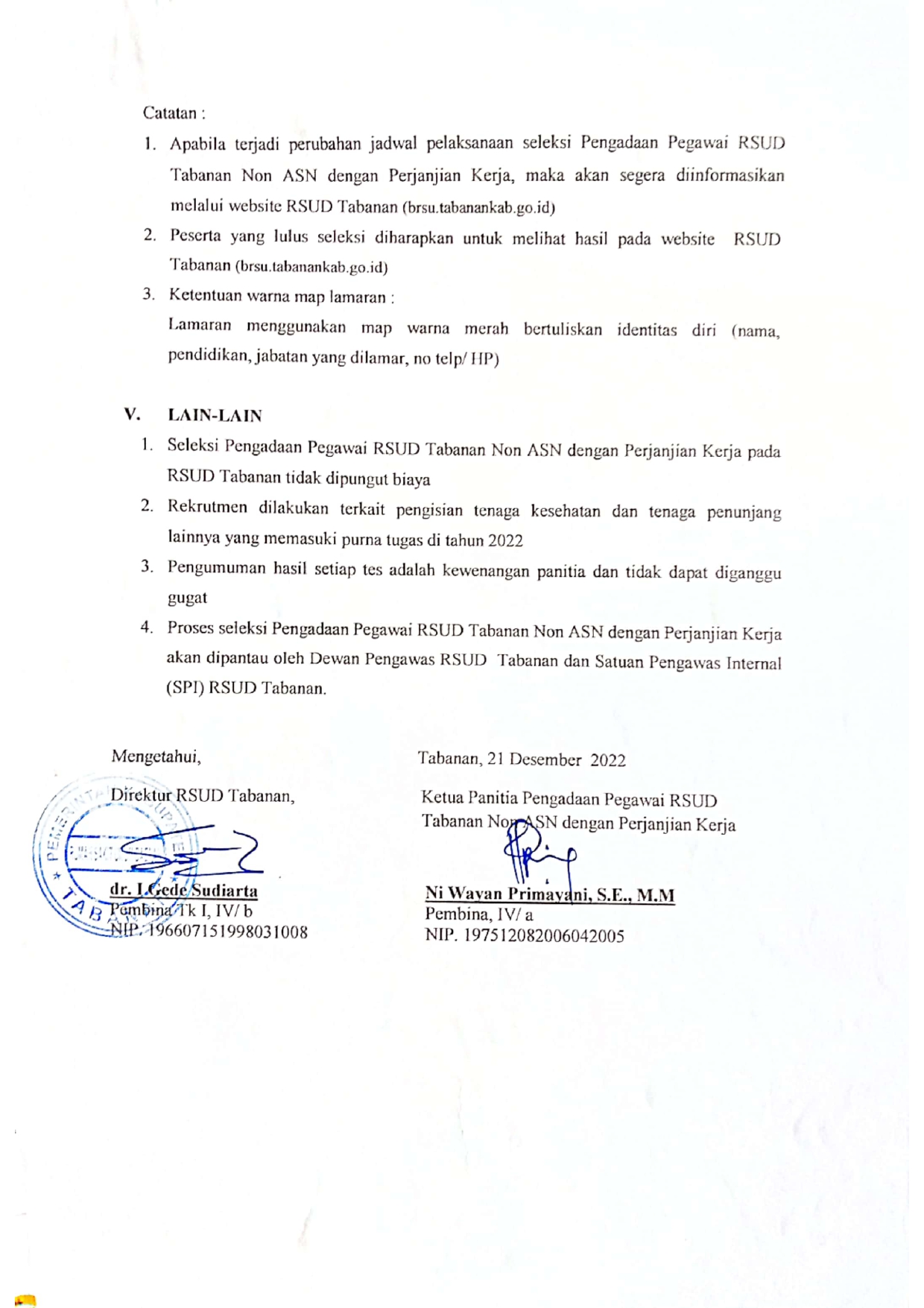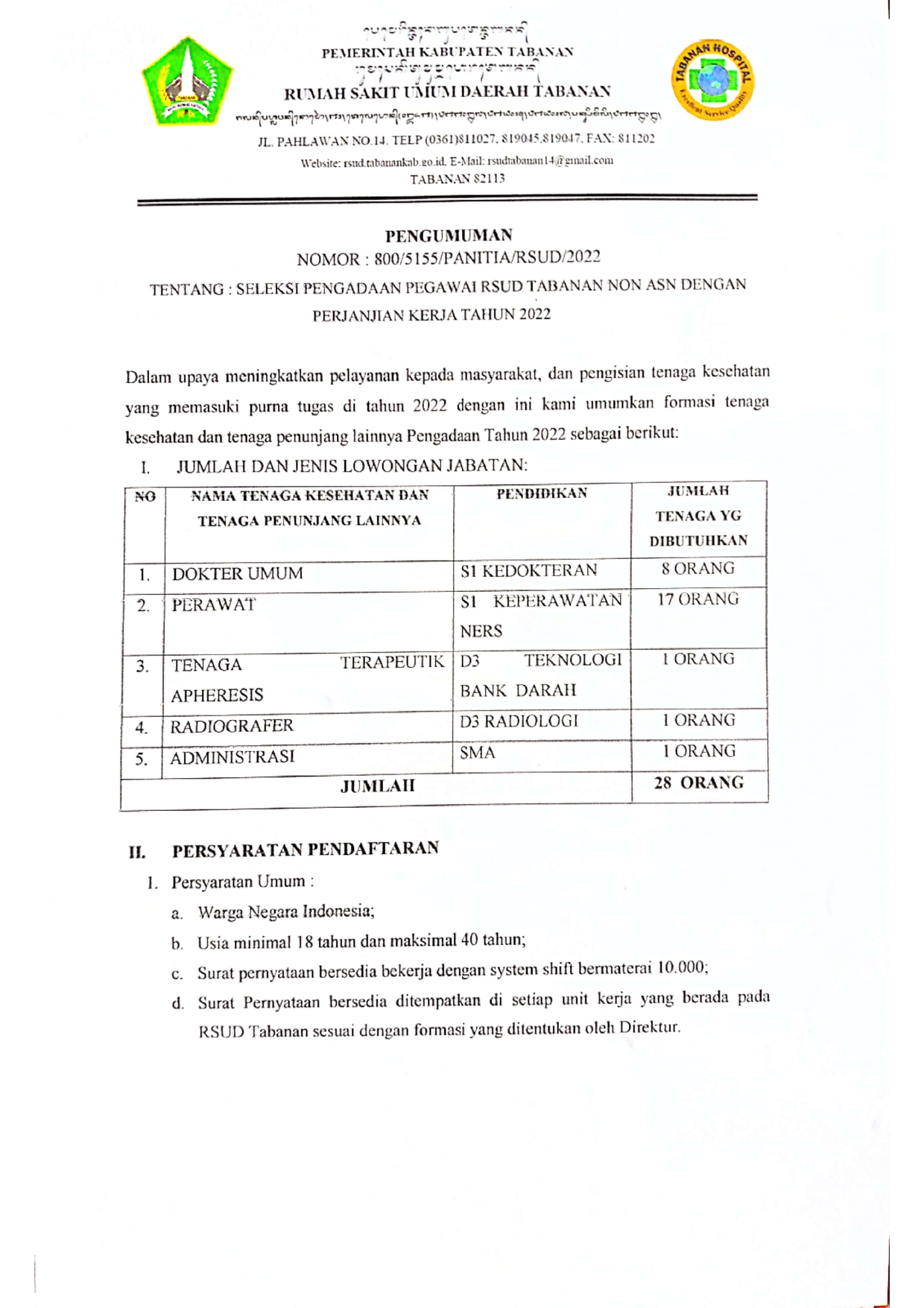 Pengumuman SELEKSI PENGADAAN PEGAWAI RSUD TABANAN NON ASN DENGAN PERJANJIAN KERJA TAHUN 2022 Admin RSUD 22 December 2022 Continue Reading Previous PELAYANAN RSUD TABANAN SAAT HARI SUCI PAGERWESINext PELAYANAN RSUD TABANAN SAAT LIBUR HARI RAYA GALUNGAN More Stories Pengumuman HARI ISRA MI’RAJ NABI MUHAMMAD SAW 1447 H dan HARI SUCI SIWARATRI POLIKLINIK RSUD TABANAN DI TUTUP Admin RSUD 22 January 2026 Pengumuman LAYANAN RSUD TABANAN SAAT PERAYAAN TAHUN BARU 2026 Admin RSUD 30 December 2025 Pengumuman PELAYANAN RSUD TABANAN SAAT HARI RAYA NATAL 2025 Admin RSUD 18 December 2025 Pengumuman PELAYANAN RSUD TABANAN SAAT HARI RAYA KUNINGANN Admin RSUD 26 November 2025 Pengumuman PELAYANAN RSUD TABANAN SAAT HARI RAYA GALUNGAN Admin RSUD 17 November 2025 Pengumuman PELAYANAN RSUD TABANAN SAAT LIBUR HARI SUCI PAGERWESI Admin RSUD 9 September 2025